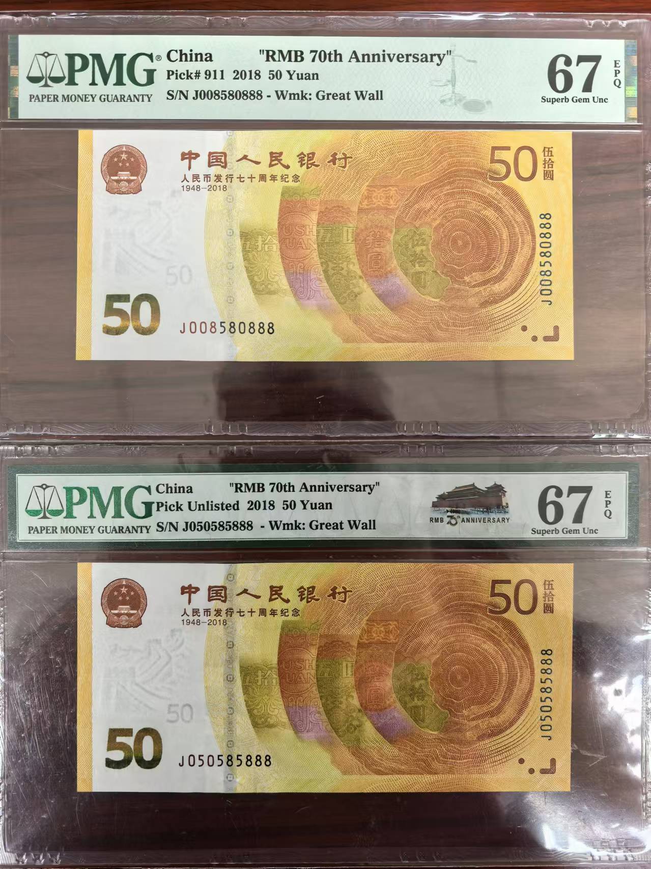 如图,70钞058人三尾888,一眼清靓号,pmg67分,3800元每张任选