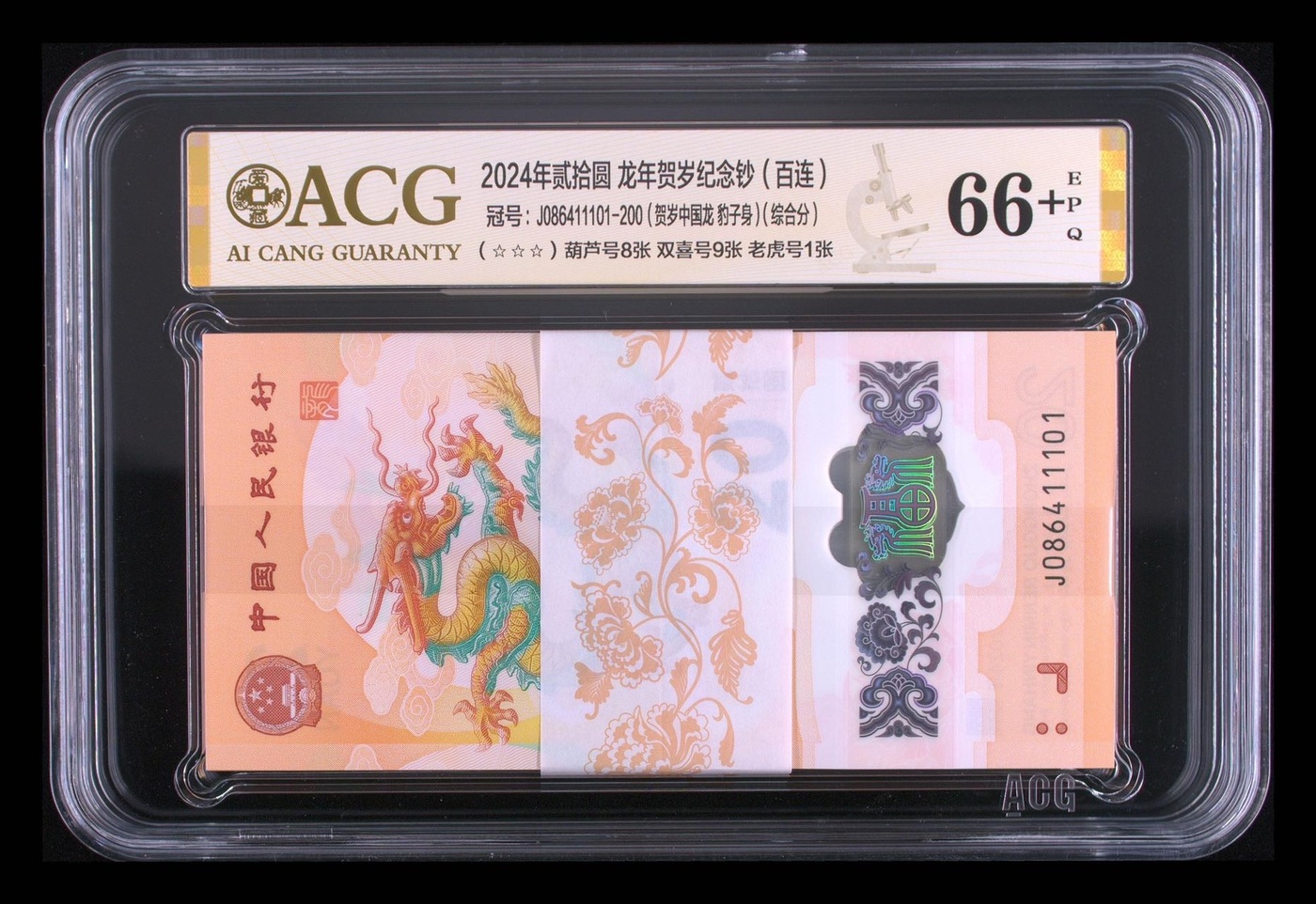 出小龙钞标准百连一刀,老虎号标百,J086411101,爱藏评级66加EPQ,售价13300元。