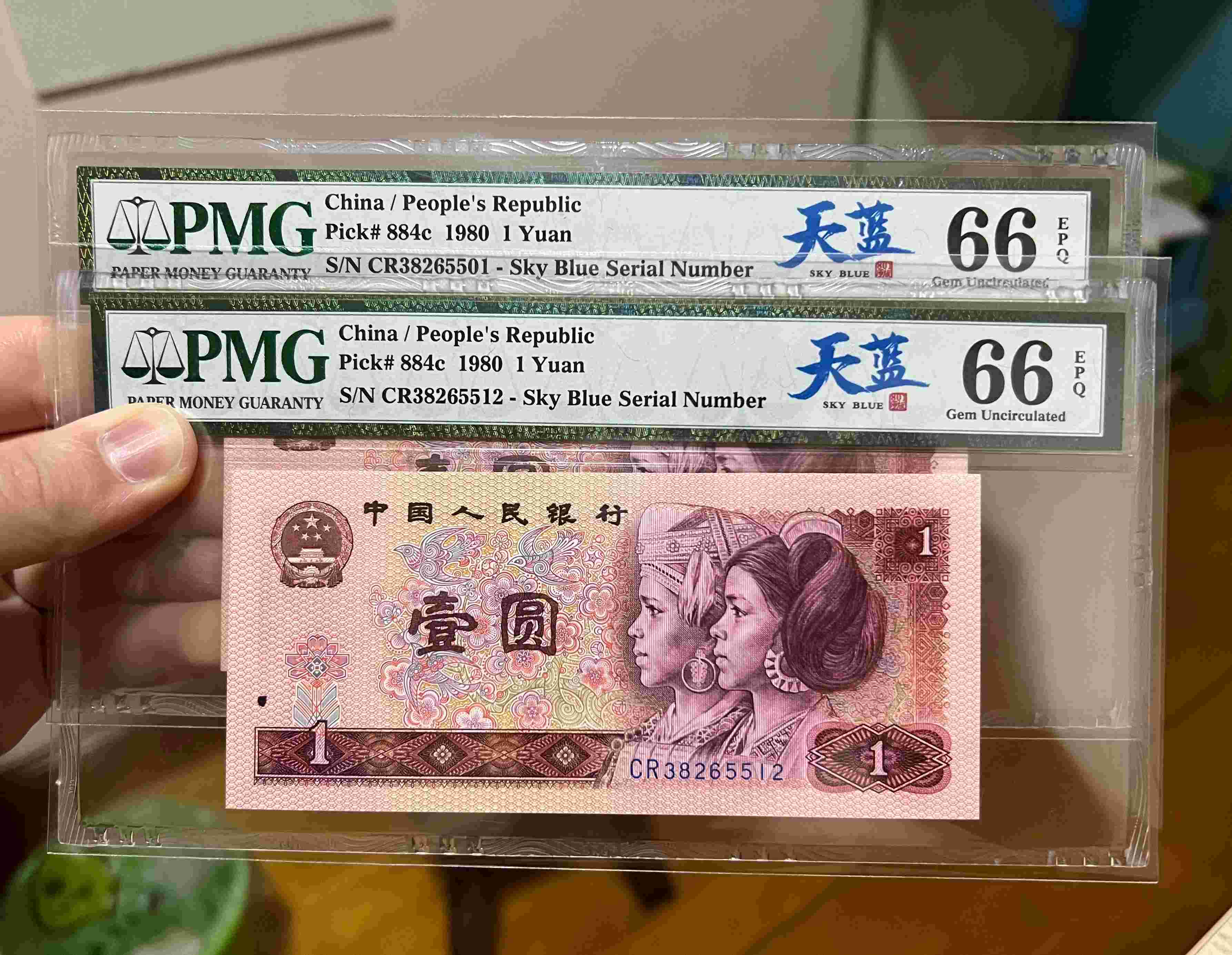 801天蓝CR无47共2张,PMG66E中文标,捆拆,四角尖尖,灯下无斑,保真具体如图,这两张一起售780元包顺丰。