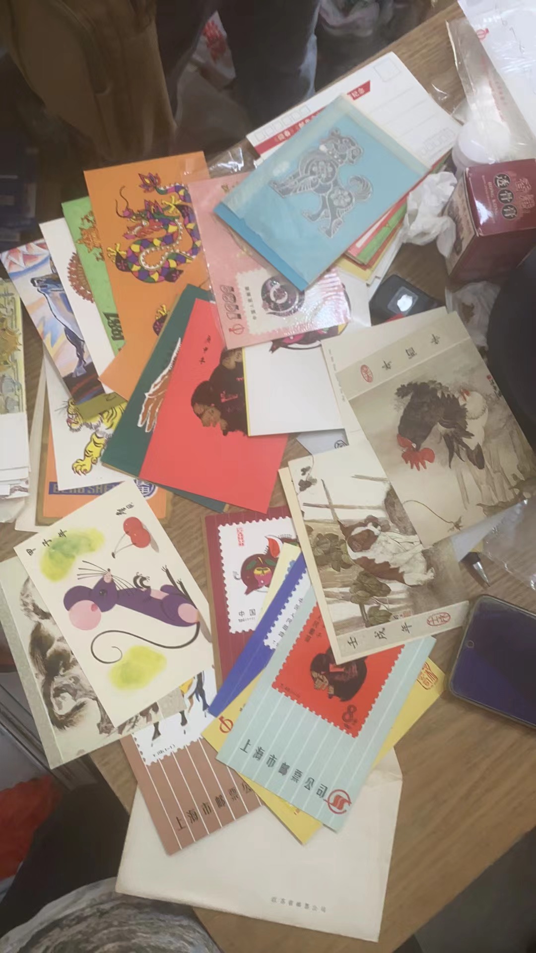 郑和一共5套 3套有袋子 2套没 徐悲鸿片2套 还有一套三国一套水浒 还有66张生肖片 共 60