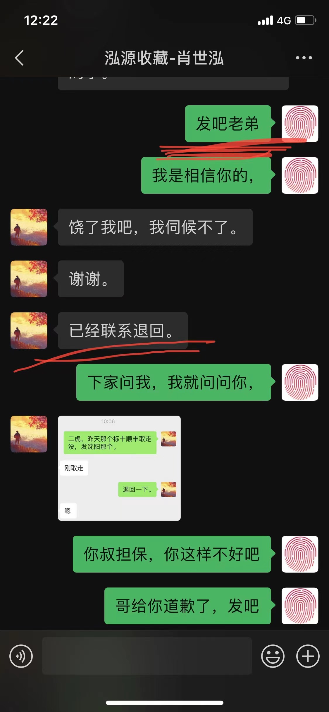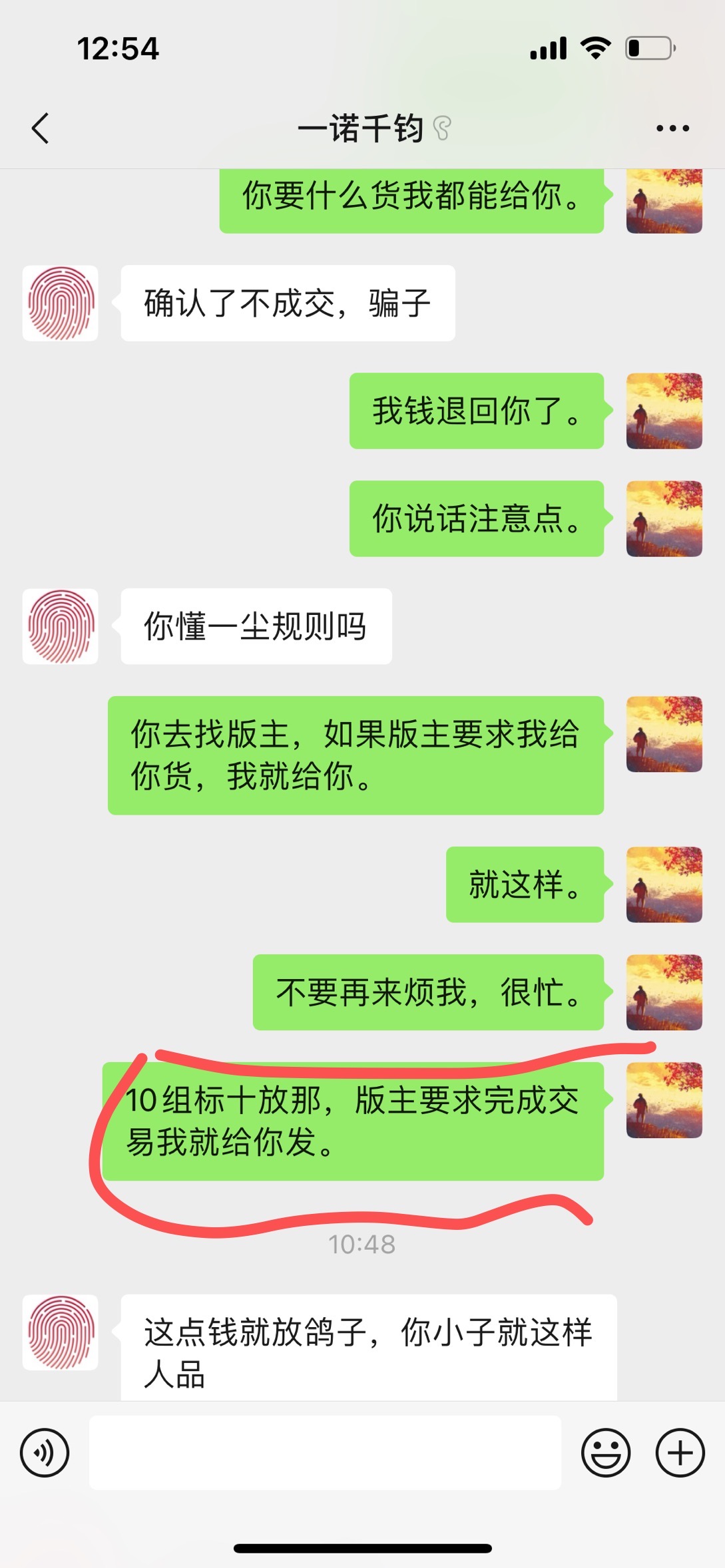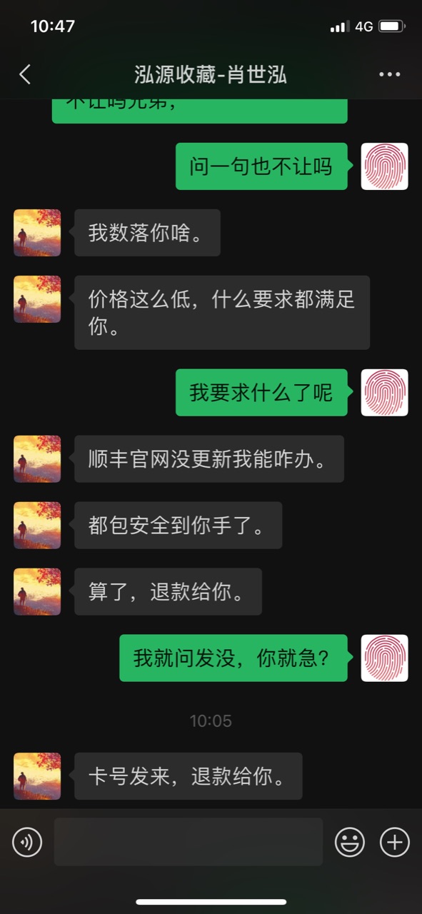 我在微信上回复“顺丰还没有来取件、实在着急你就退款吧”,并于10:29分将货款6500元转回买家招商银行卡。买家不同意,我在微信上让买家找版主仲裁,随后10:40分买家在微信上辱骂我骗子,11:21分再次辱骂我区区小利不够我家人看病,我也在微信上辱骂买家还击。
