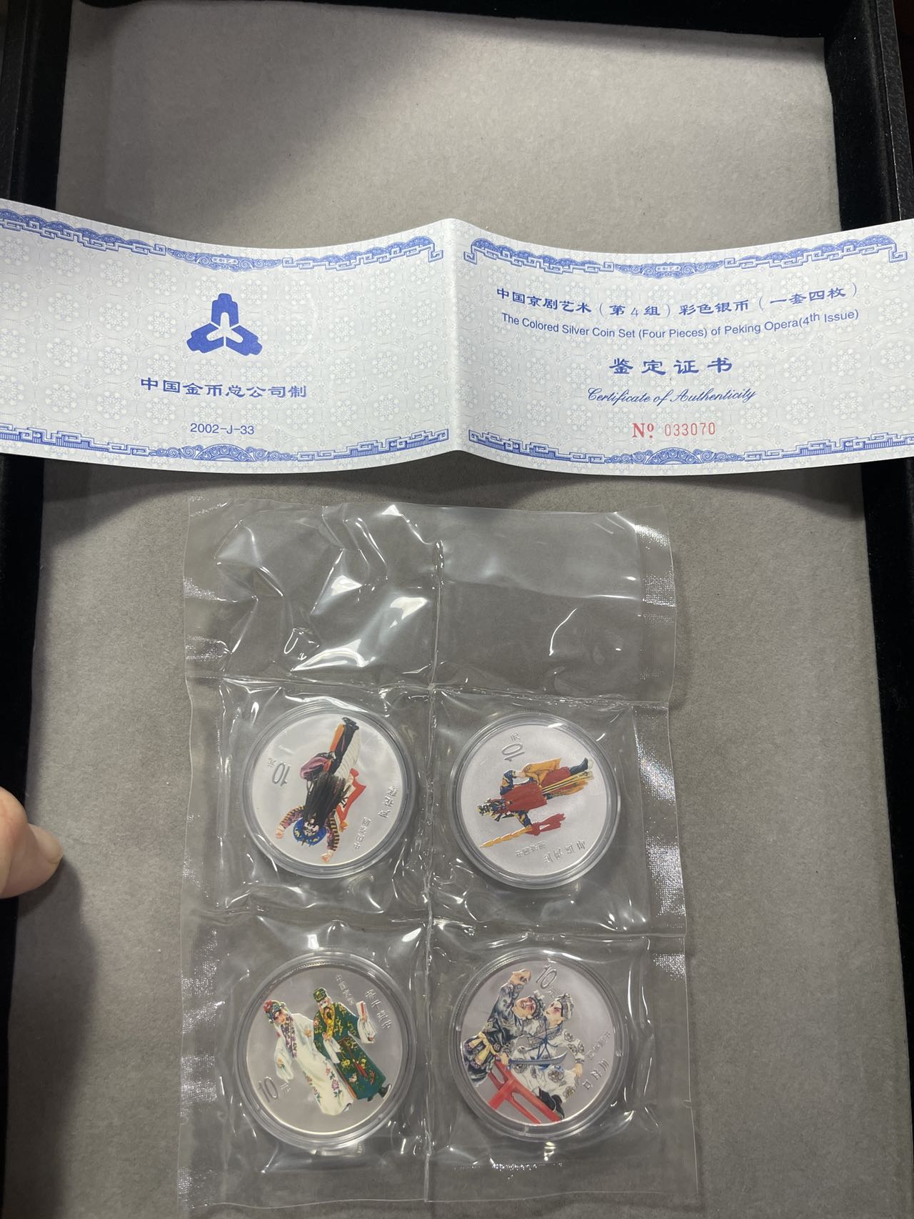 → 京剧银币,4枚一套,一枚31.1g纯银,带面值的法定货币,品相好,带证书。价格也就比银价高点。1000元一套。不议价。就5套。