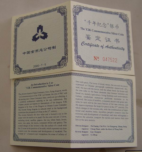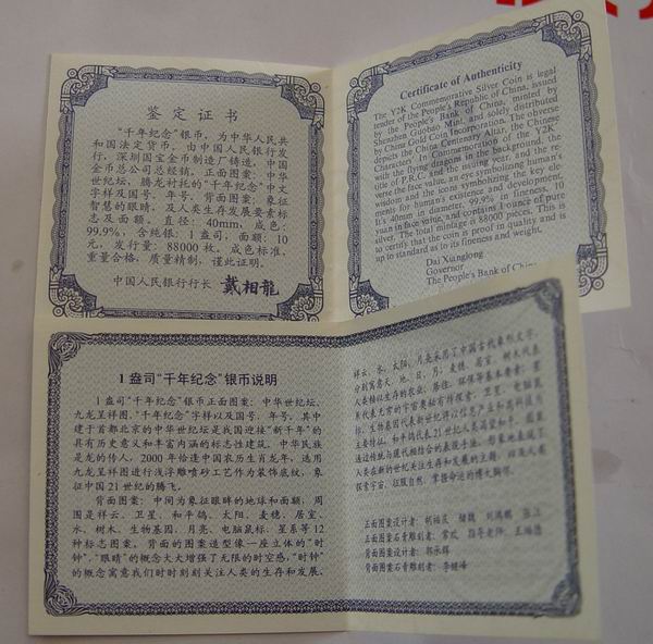 出售2000年1盎司千年纪念银币,无氧化,证书齐全,售价:1200元,包顺丰。