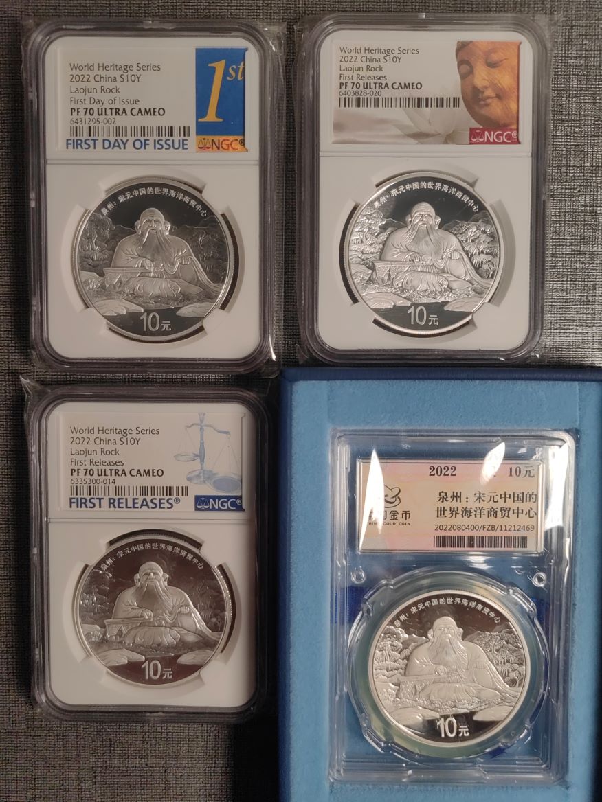 → 出泉州老君岩30克银币NGC70分首期,首日。金总封装,空盒