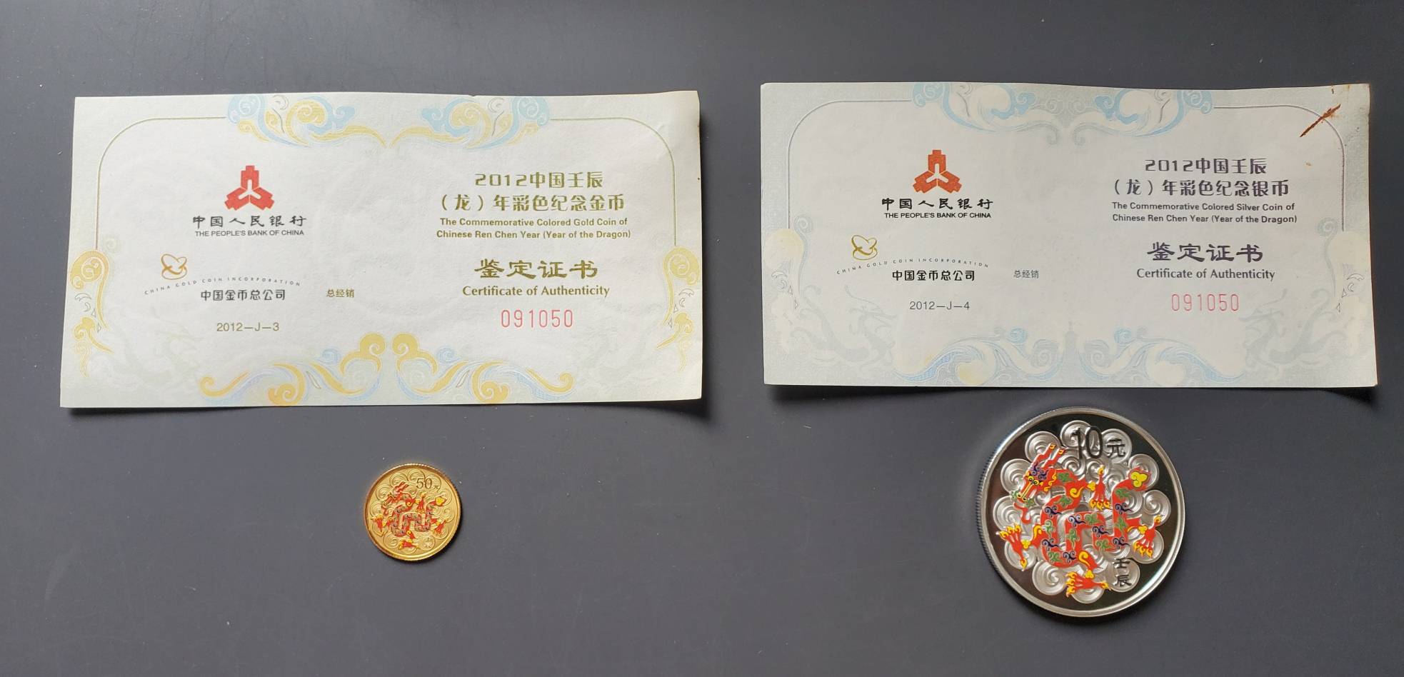 2012年龙年彩色纪念金银币(有证书)不议价