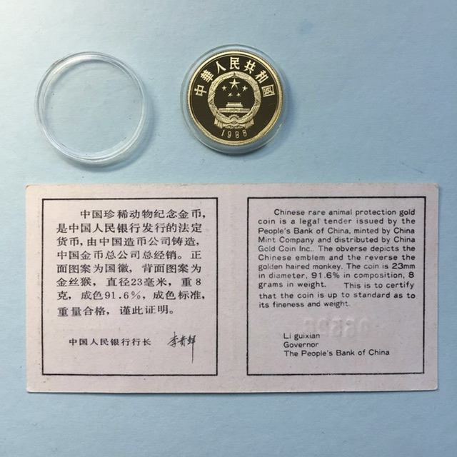 (2)1988年中国珍稀野生动物8克金质纪念币(含证书)当天当时金价X8+100=售价;5061元 ;