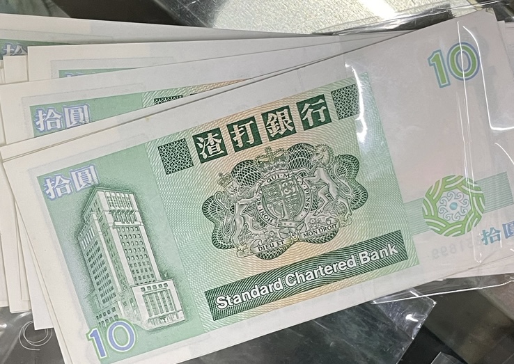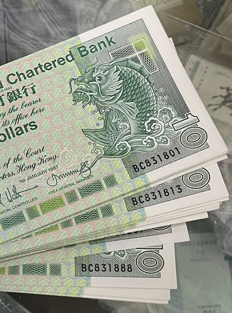 → 售渣打小鲤鱼10元英标1987年99连号无47尾888
