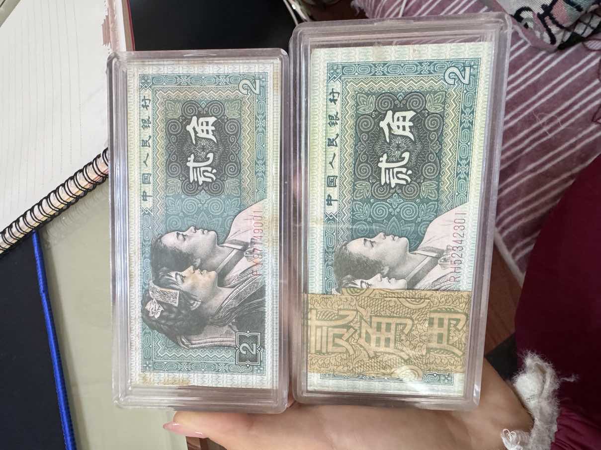 贰角纸币两刀。品相有点黄,具体微信看细图。2.8一张一起卖。FY87149001、RH52342301