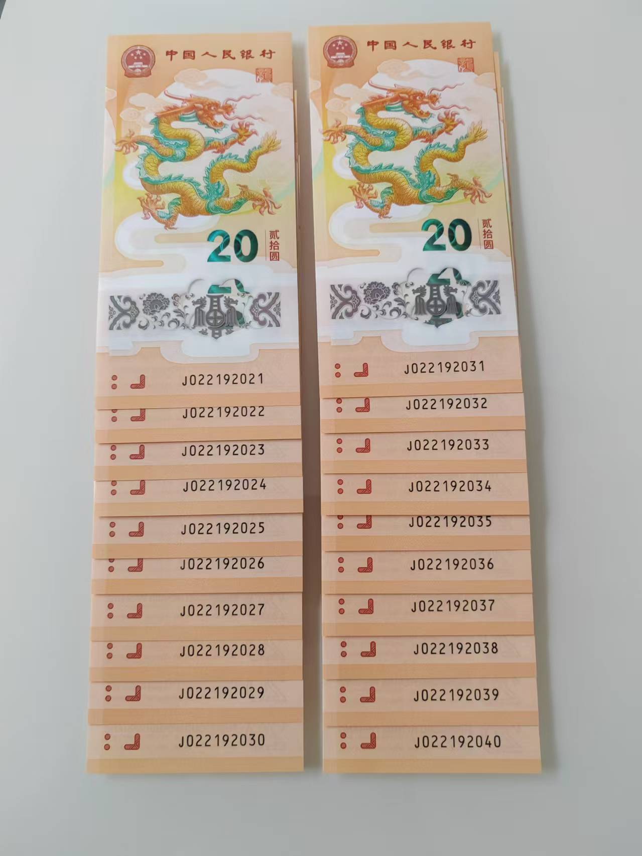 出小龙钞无3457年份号尾2021~2040标二十连,含龙年尾2024,2036,一手货,品绝,通走11500元包邮