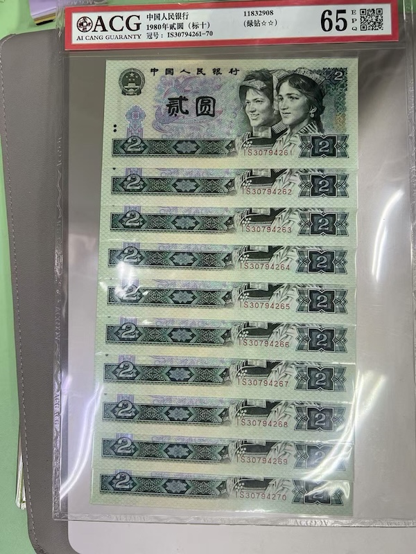 802绿钻,爱藏65分epq3星,就个别几张后边灯下有几个小点,品相很好