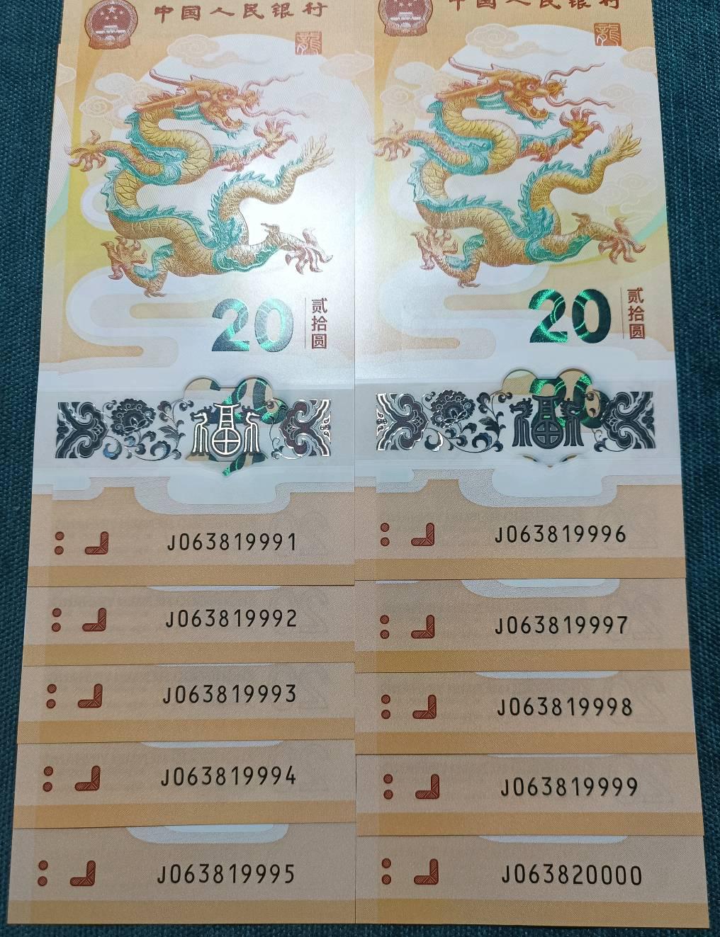 2024年龙年纪念钞双师子号标十:J063819991-J063820000