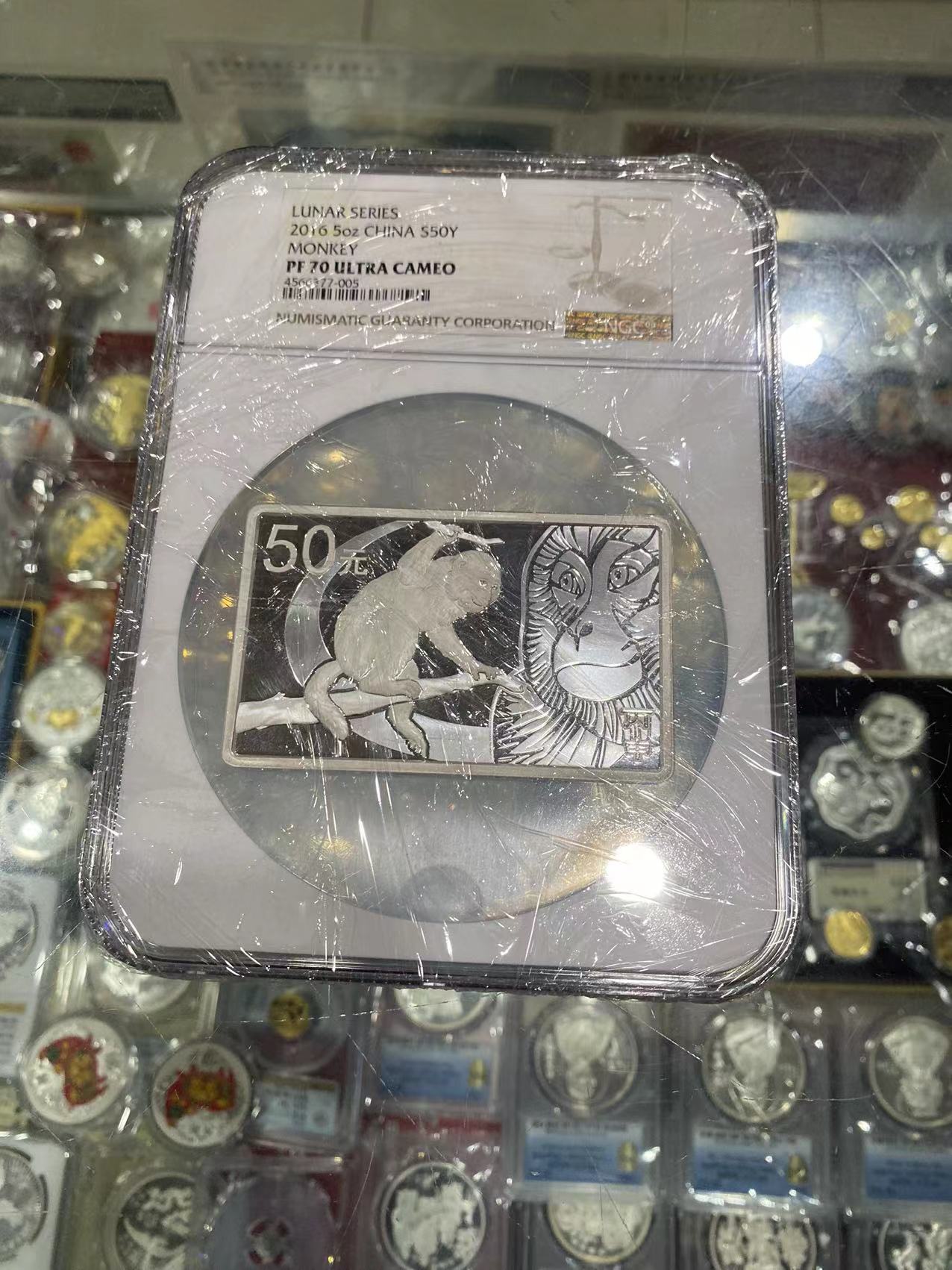 低售NGC70分16年五盎司方银猴一枚。