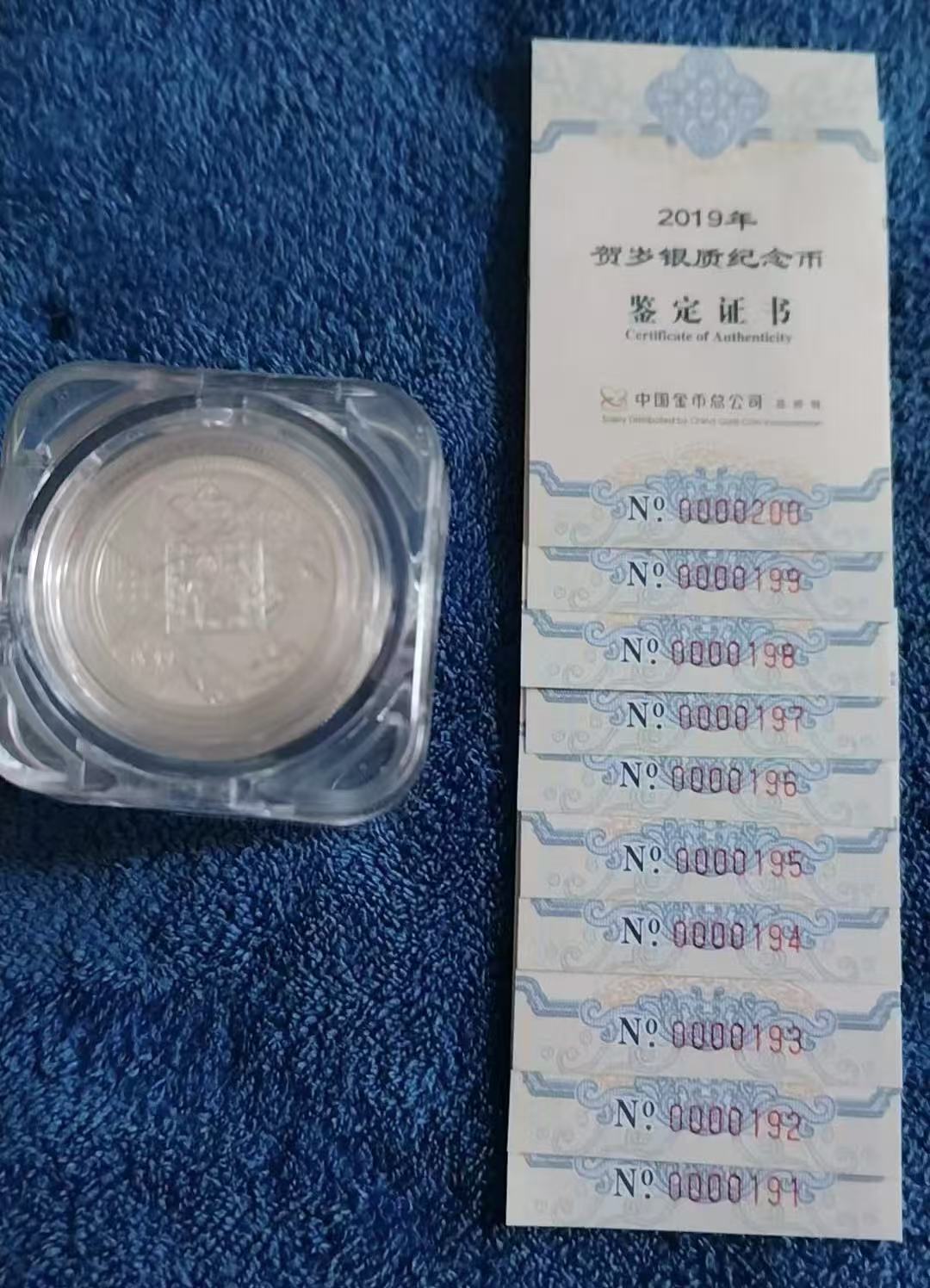 → 2019年福字币一桶,漂亮证书号0000191一00002007,倒置号,人二,人三