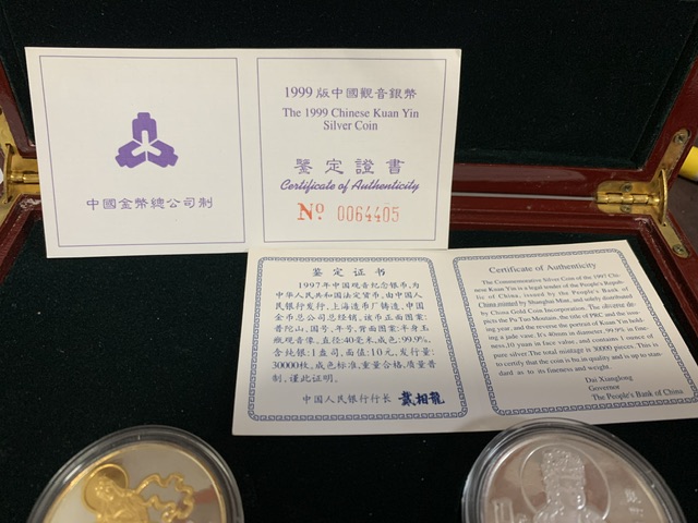 1200出两枚观音银币(1997年、1999年)无盒有证书,顺丰包邮