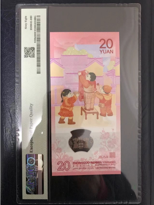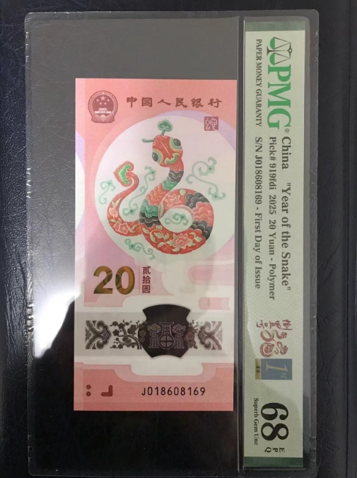 #纪念钞2025蛇年纪念钞PMG68分倒置号,福蛇倒置号金蓝首日中文标,