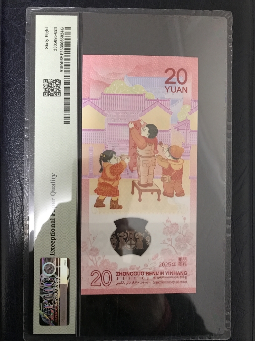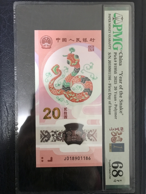 #纪念钞2025蛇年纪念钞PMG68分倒置号,福蛇倒置号金蓝首日中文标,