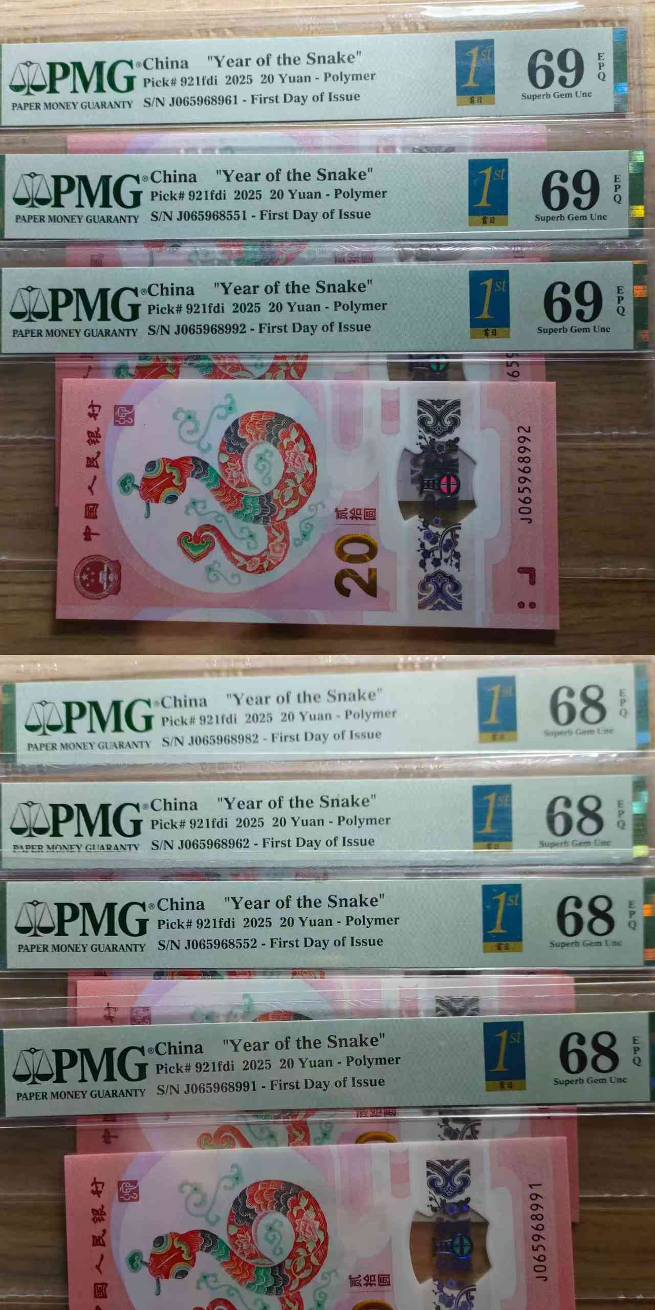 出蛇钞首日金兰标pmg69分68分金马号如意号 69分的700一张通走包顺丰 68分的280一张通走包顺丰 电联确认