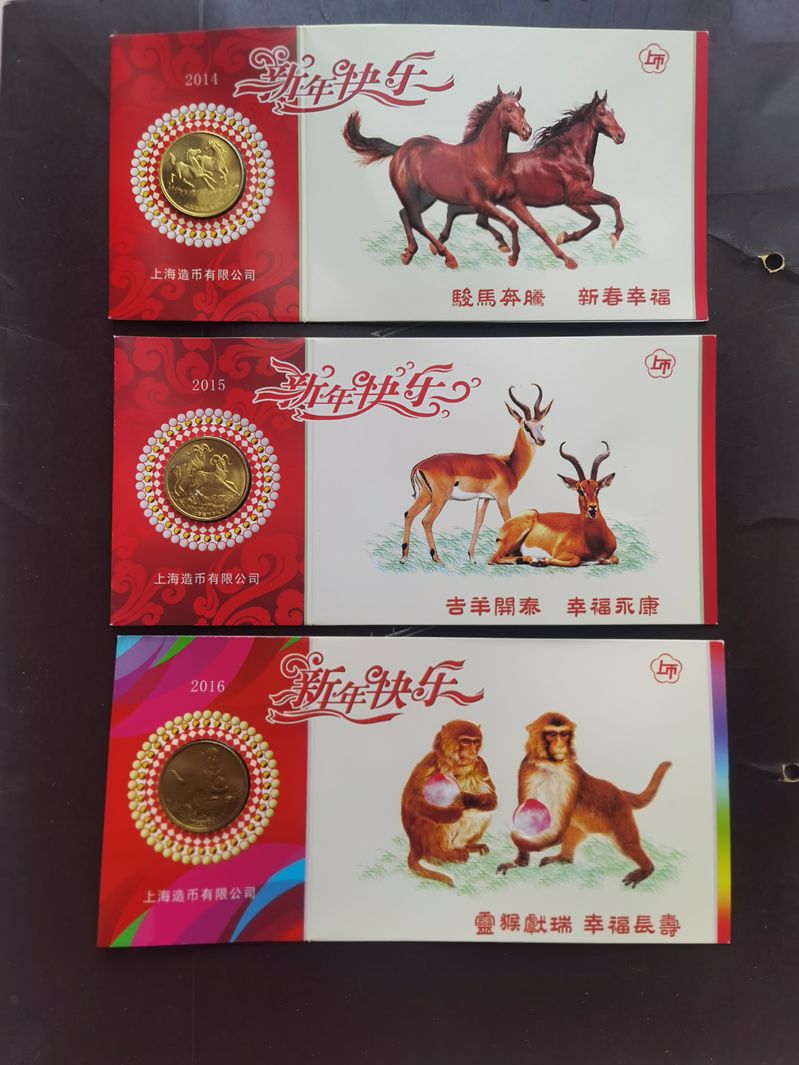 好品上海造币厂生肖币卡,96年43本、14年10本、15年2本、16年4本。合计59本,6.5元一本,合计384元包邮。