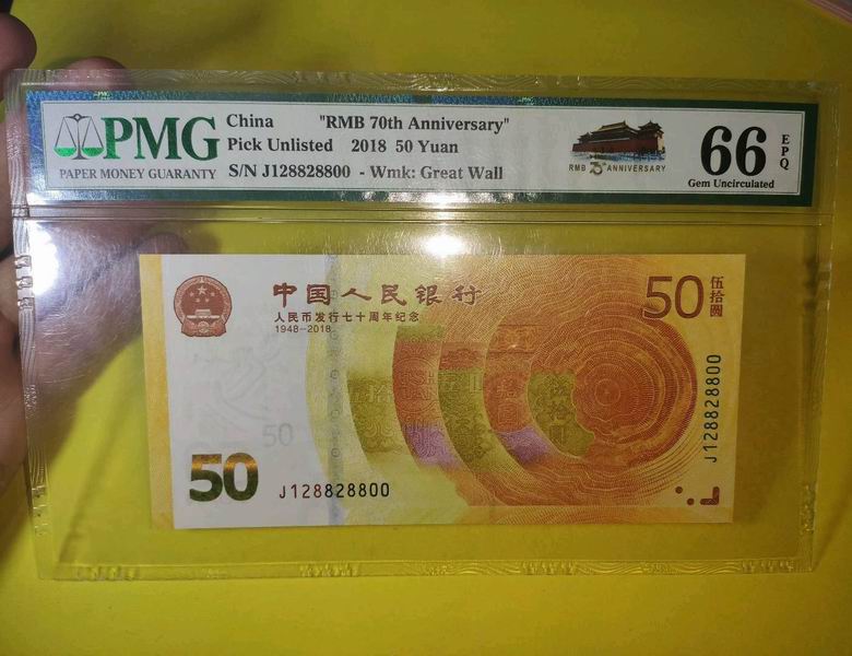 J12882800,70钞小循环、朦胧号、小循环、双喜号、三对子,题材多多,一眼清,PMG加天安门标签,售1880元包顺丰。