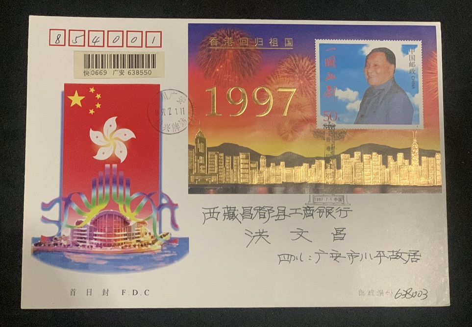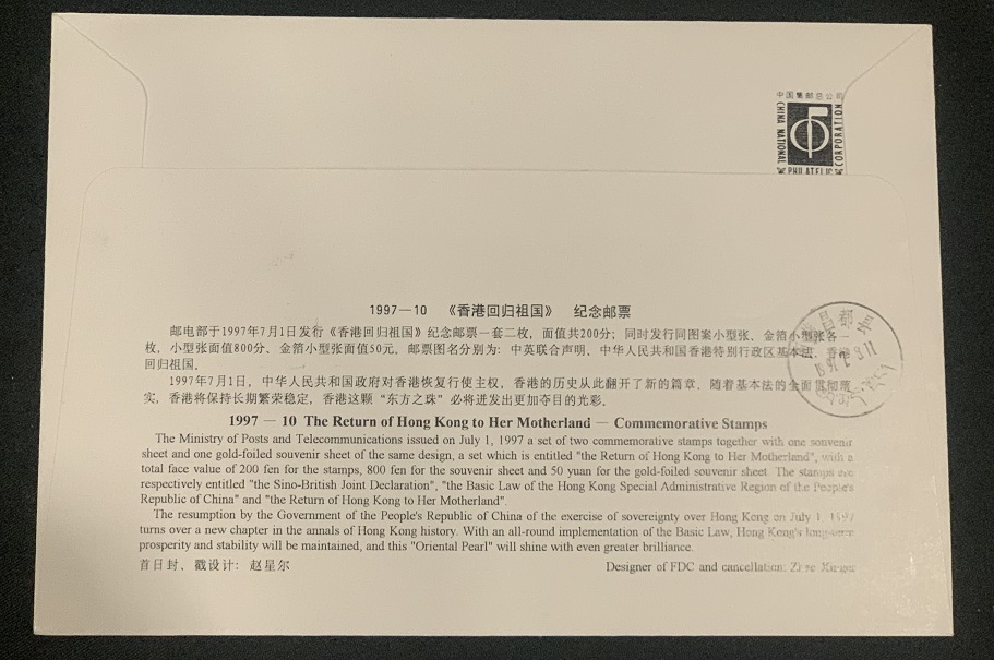 97香港回归(金箔)首日实寄封一枚 380.00元