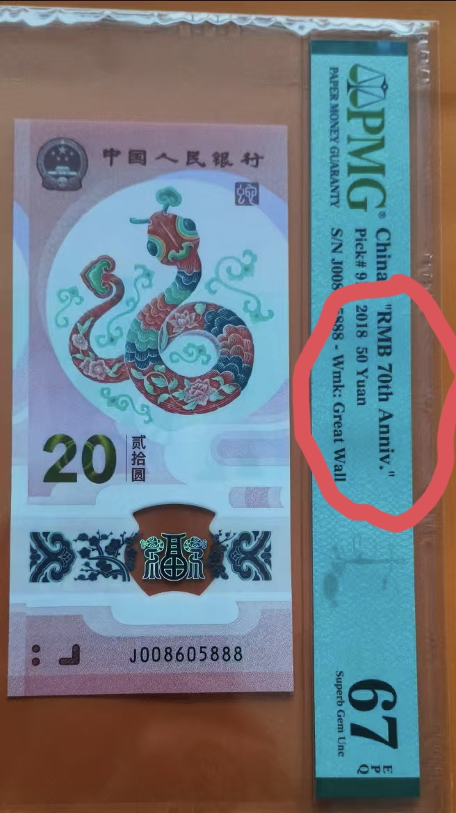 008605888【PMG67】【中国人民币70周年】生肖蛇钞,特惠价4688顺丰包邮!