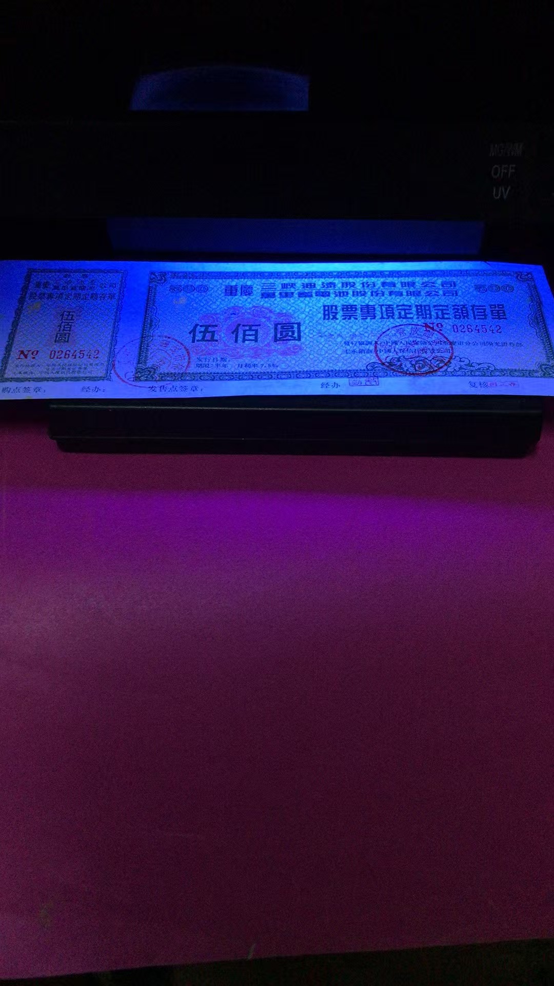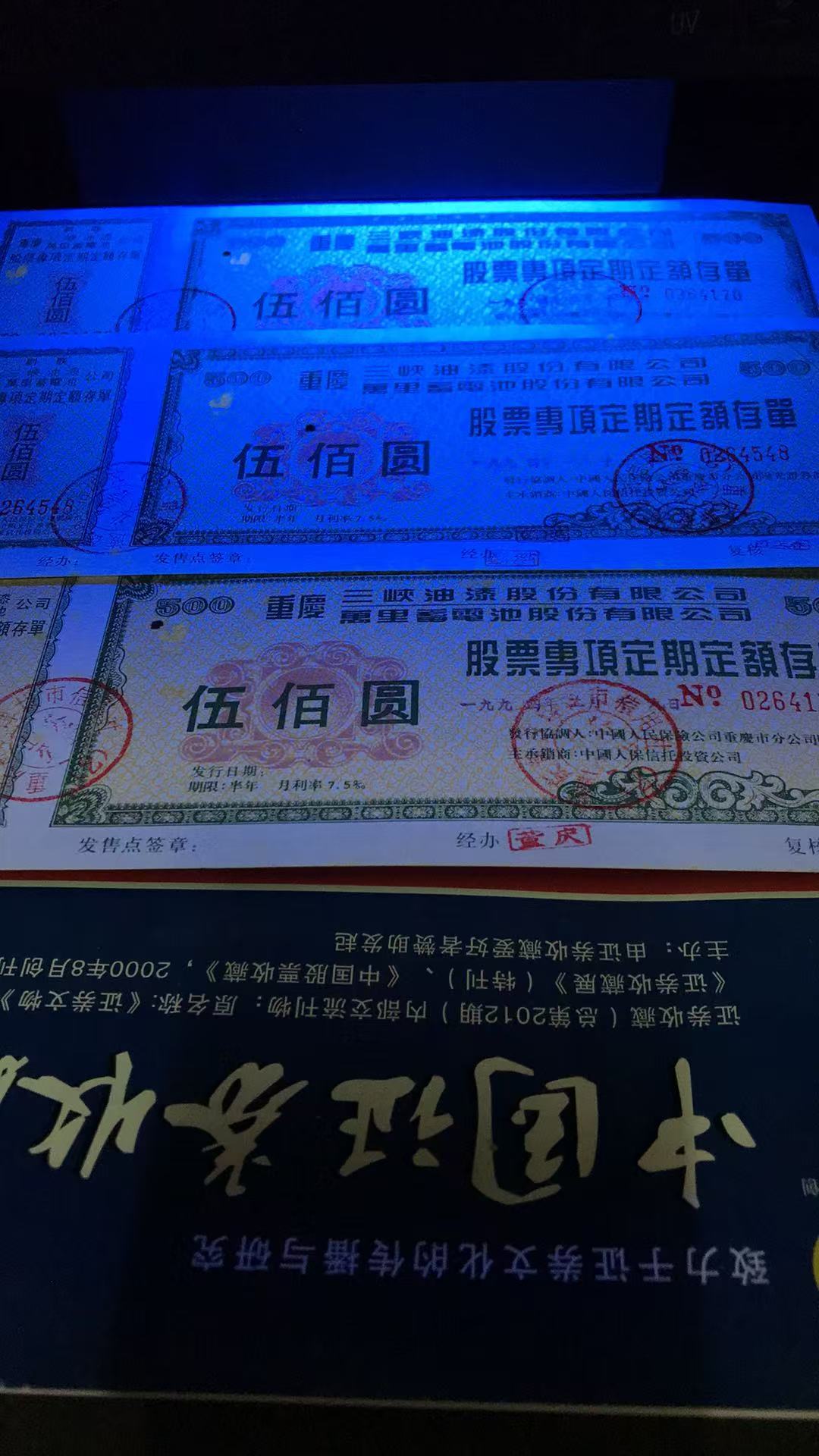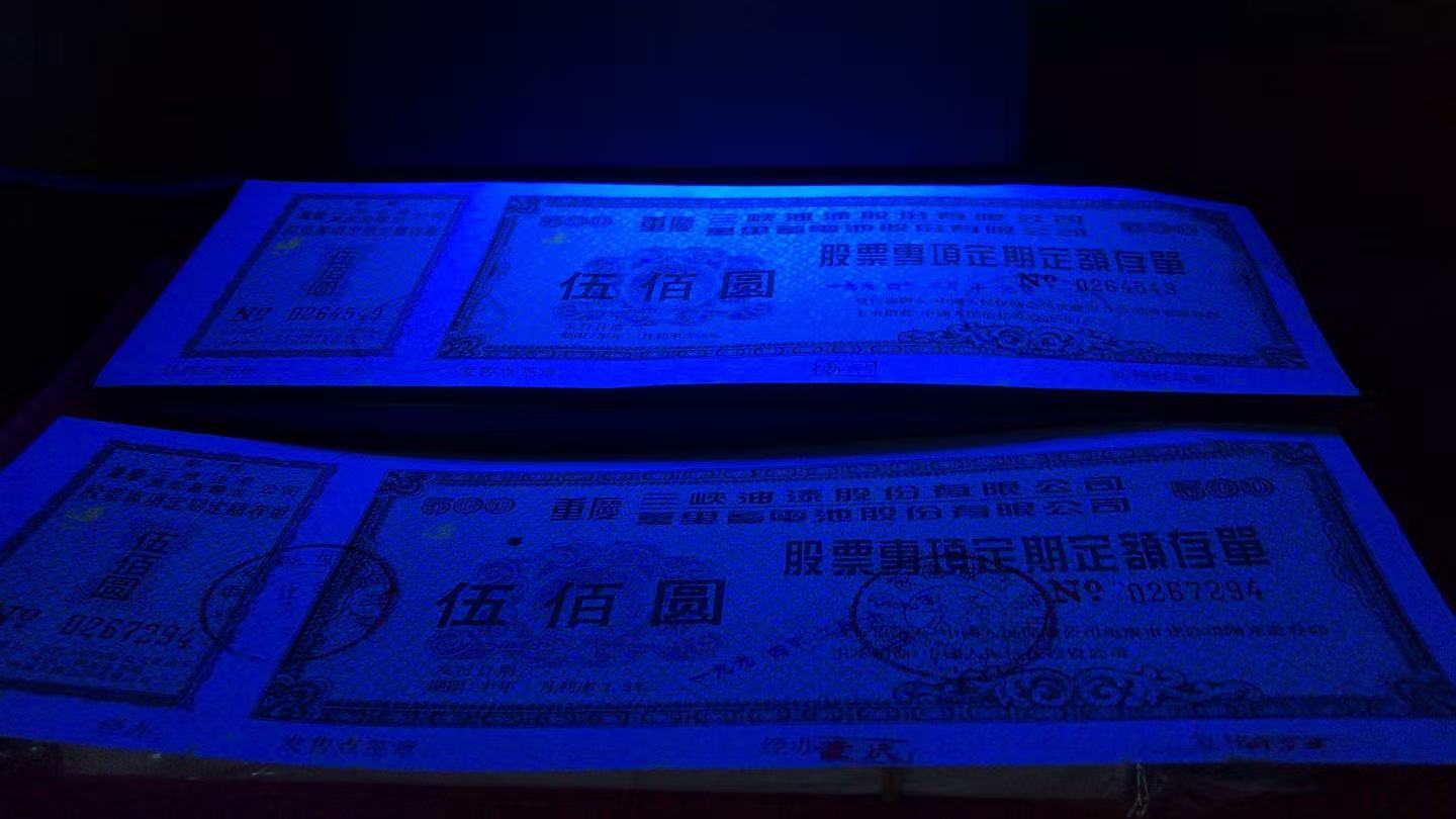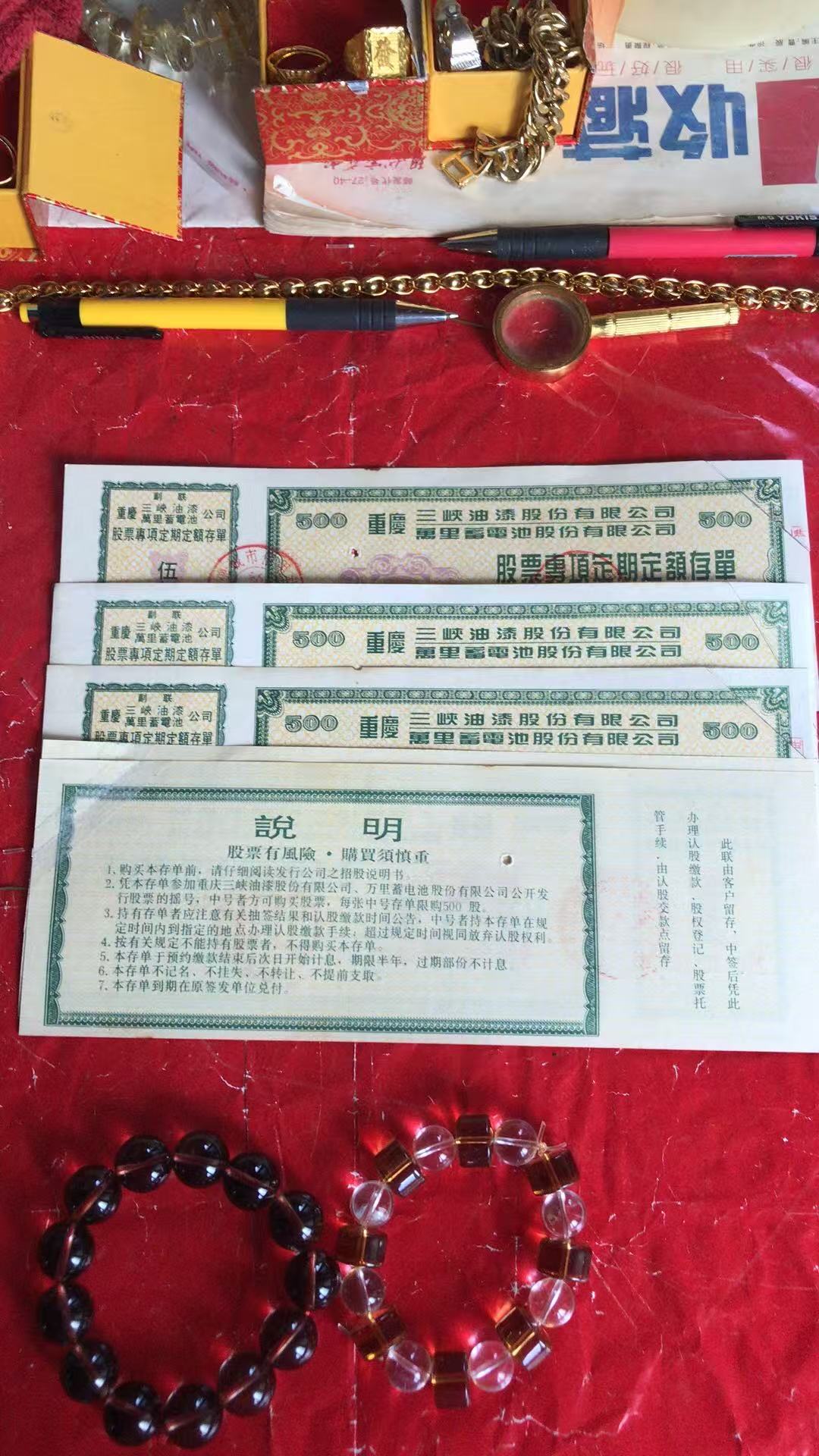 批发中国大陆上市公司珍稀三级文物罕品(重庆万里三峡油漆)股票专项定额存款单三联全张1000枚(右上角粘贴八品)500万元整。暂知存世量1500枚左右。经党中央国务院证券监督管理委员会批准向全国各地人民公开发行。印钞纸底纹花边字体33处隐藏暗记荧光显示编码和公章金红色左上角和正联左上角显示金黄色集团商标多种高新尖端科技防伪标识。一轮猴大版发行量10万版暂知整版的存世量量二万版市场价56万元一版。第二套人民币王暂知存世量一万枚品相好的35万元一枚。没有比效就没有伤害。中国上市公司金融证券历史文化遗产三级文物罕见品几十家证券钱币博物馆永久收藏文物有证书。有国有二点三亿股民只票有千分之一的精英人士参入收藏投资理财稀有文物资源资产配置保值增值赢利套利。加上中国有2000万投资收藏爱好者的参与市场潜力无限巨大升值空间保值增值收益无限增加。此信息仅供参考用。