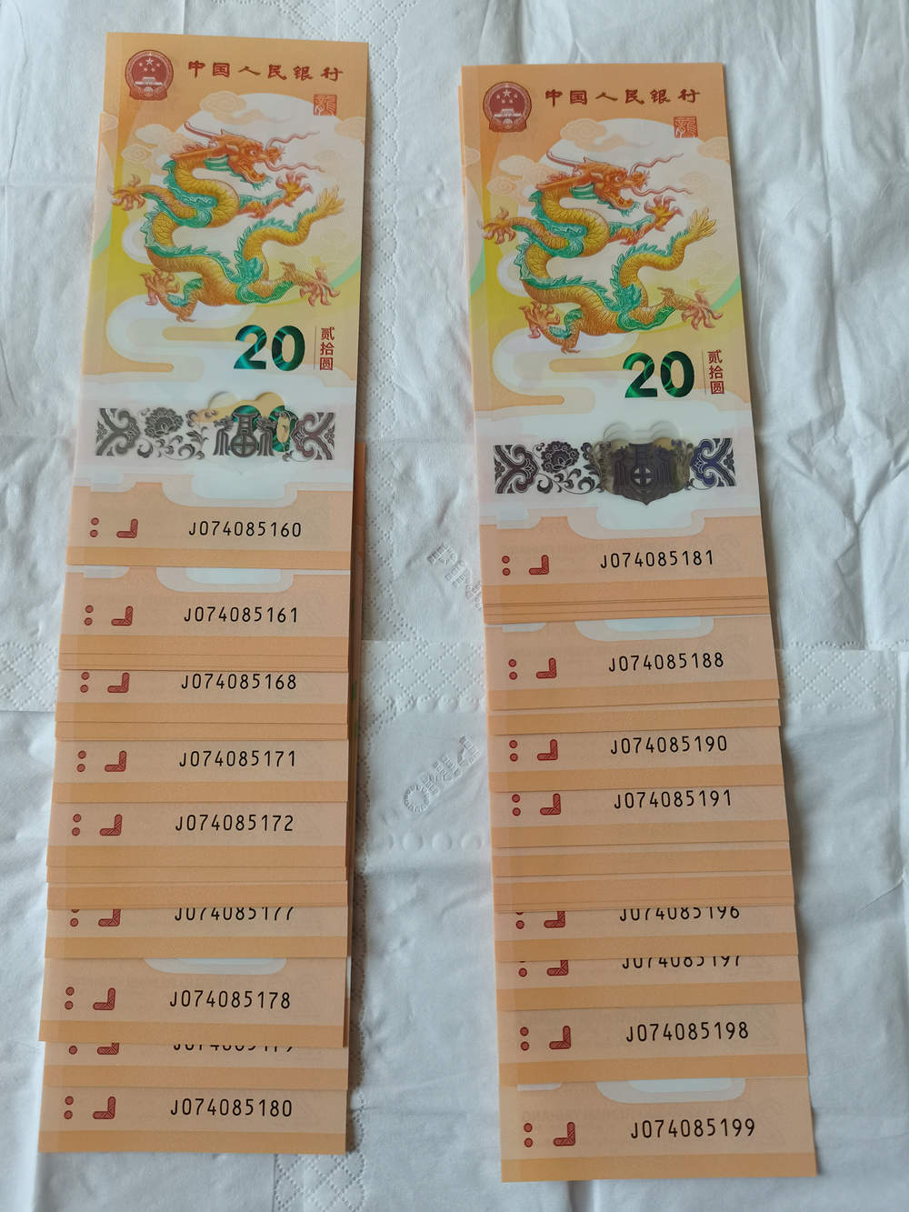 小龙钞40连,号码J074085160~5199,含3组标十,带尾168、尾88等靓号。