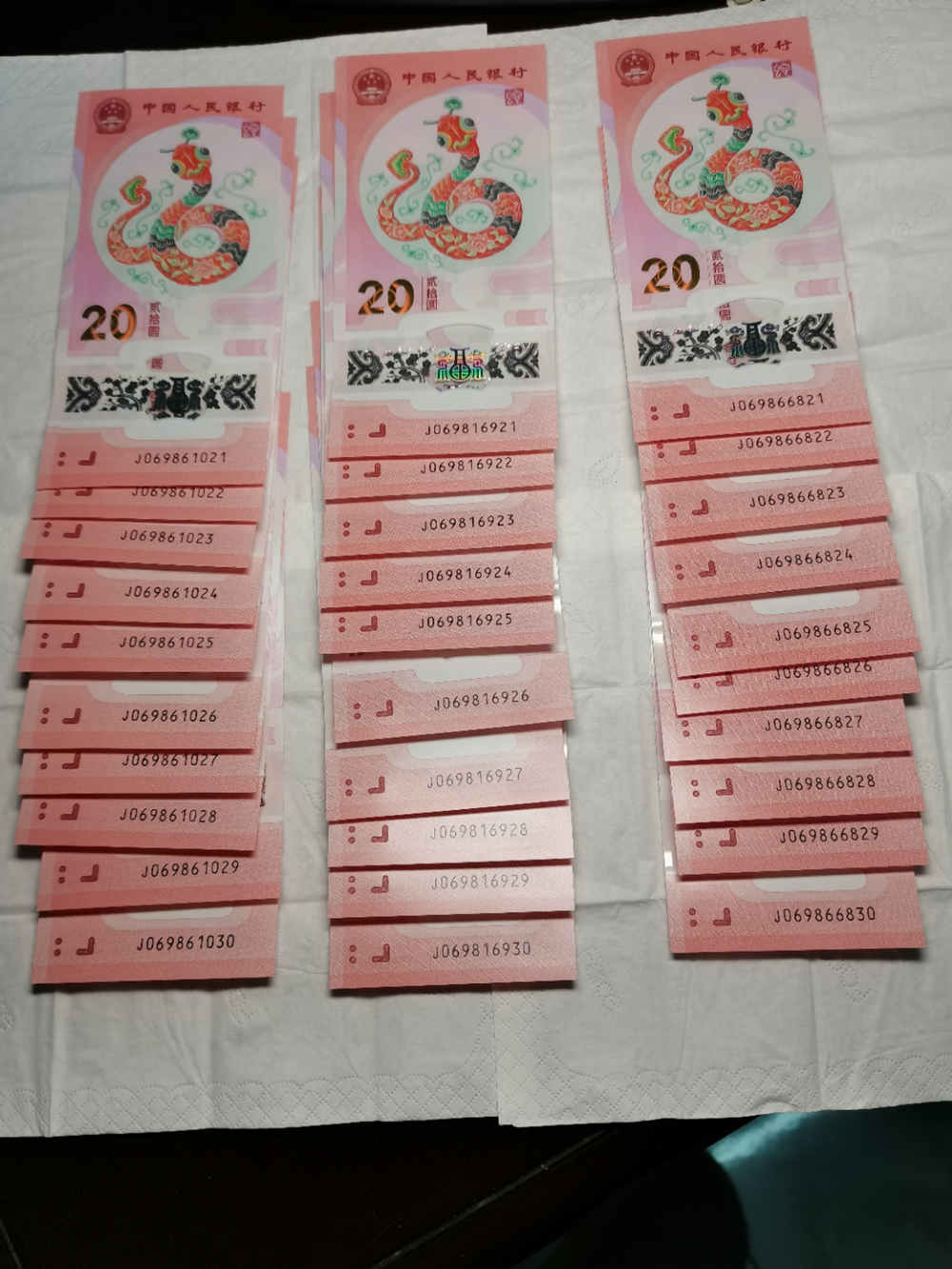 蛇钞朦胧标十3组 ,每张前7位均倒置号或圆圆号码,第2组还是五福倒置头满号标十,第3组还是02689组合满号龙珠