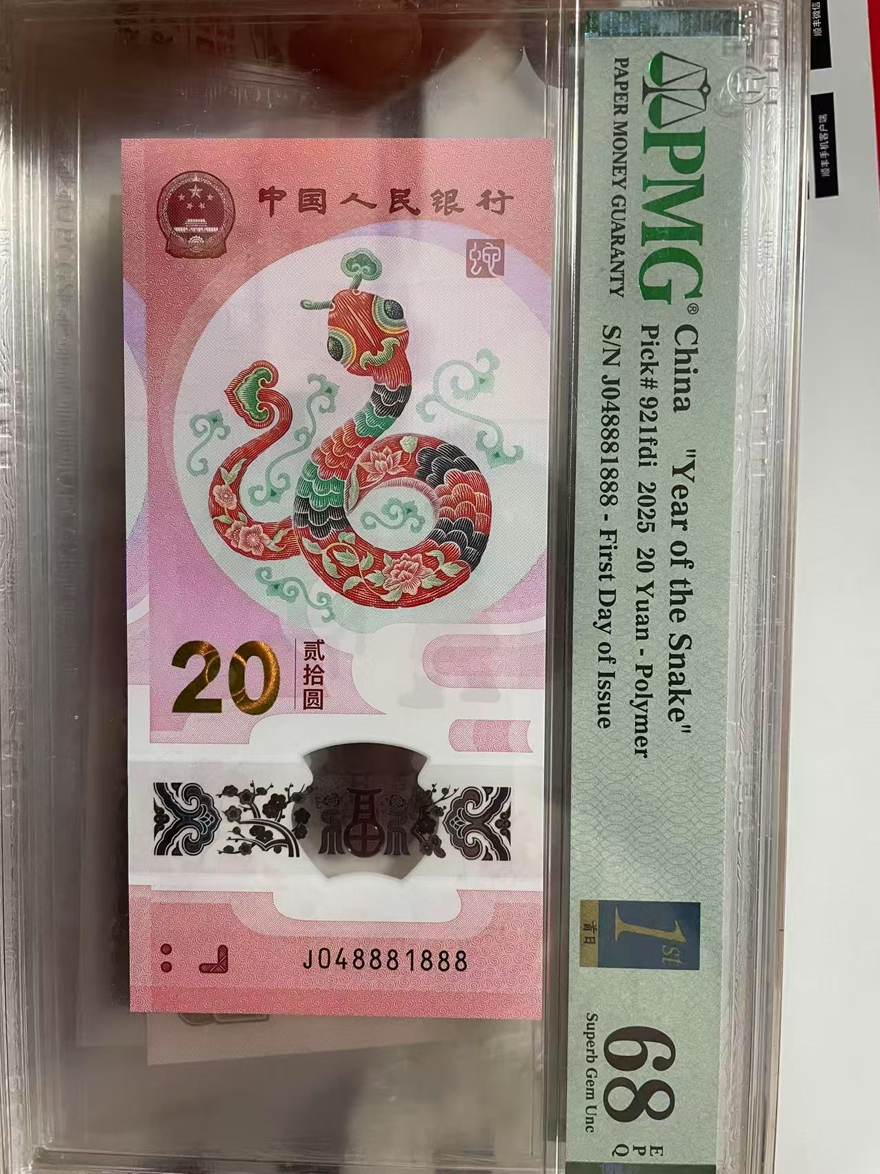 蛇钞双豹子 J048881888 PMG68 首日标 壳子有磨花 售 2680元