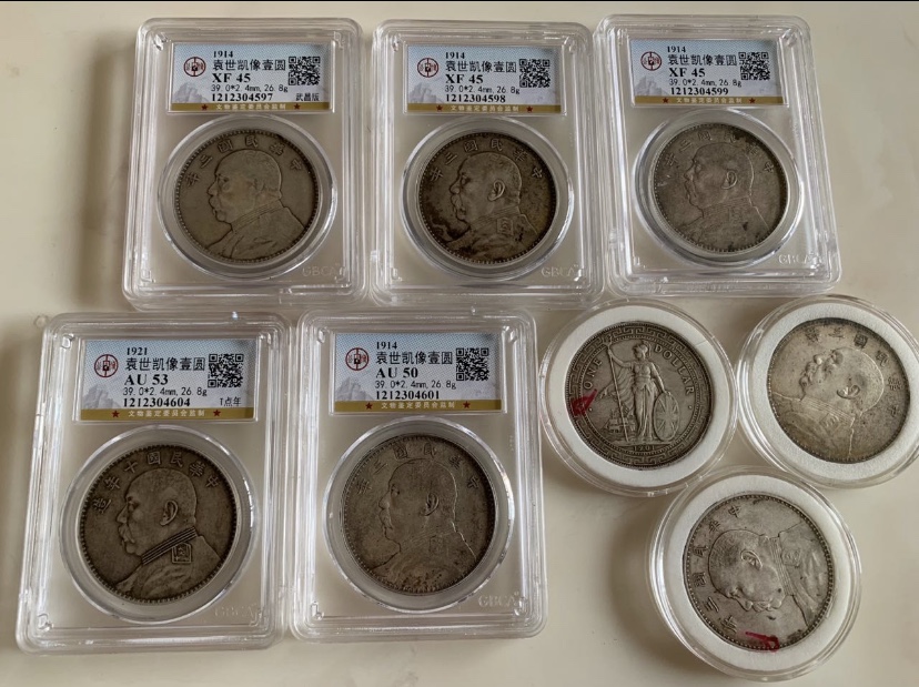 出公博45大头及裸币美品大头共8枚,品如图,包老保真,公博XF45的5枚,其中一枚武昌版,裸币3枚(其中1枚站人),品相都很好,一起出1200元/枚总计9600元顺丰到付。