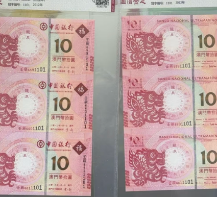 澳门龙钞三连体,倒置号一对。6611101,,价格2180包顺丰不议。、