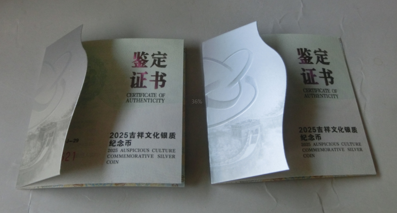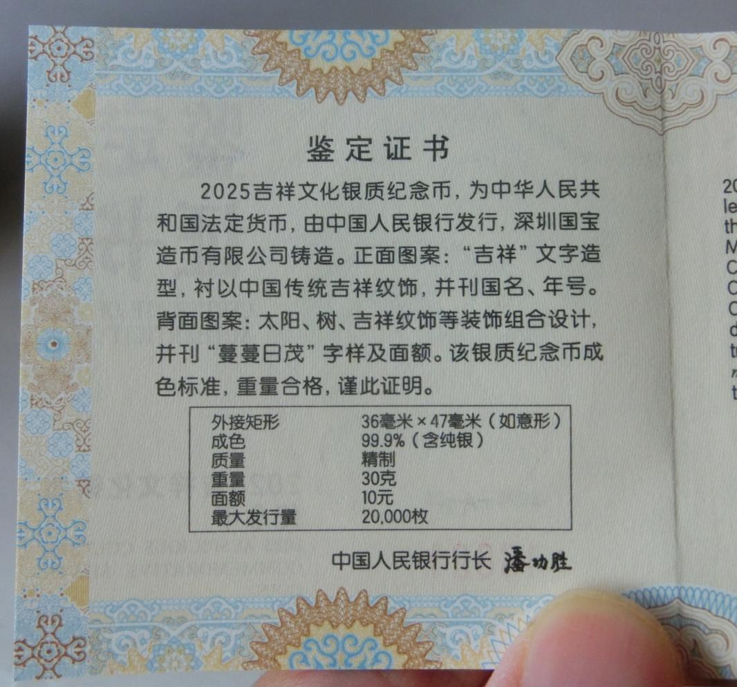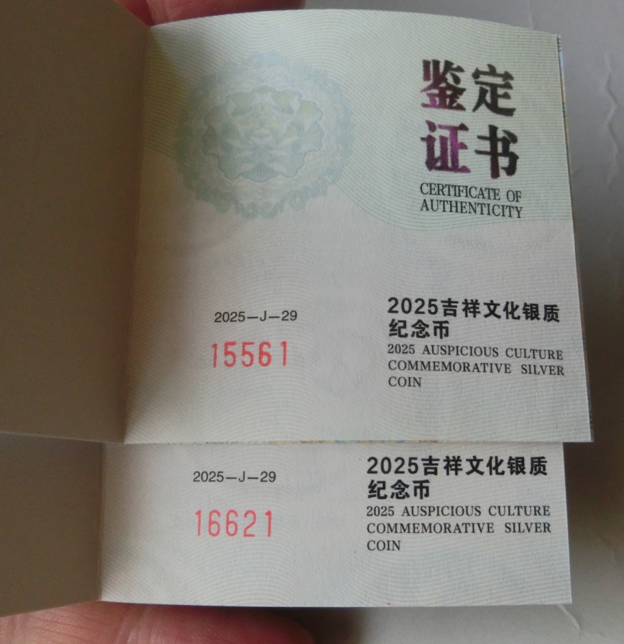 如意头、摇钱树、2025年吉祥文化系列、蔓蔓日茂精制银币,证书无347号,仅需980元每枚、证书带四仅需750元每枚,四枚通走仅需3400元。