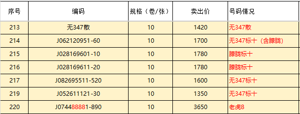 → 出无347蛇钞散张、标十、以及老虎88888一批,号码价格如图