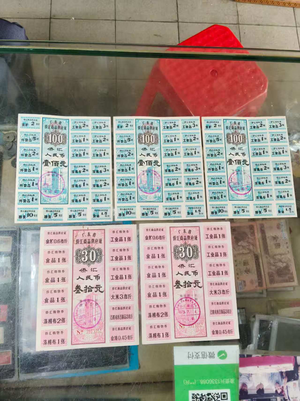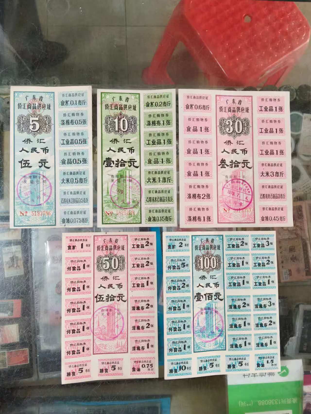 → 出原票79年完整版广东省侨汇商品供应证5.元10.30.50.100.共10张如图
