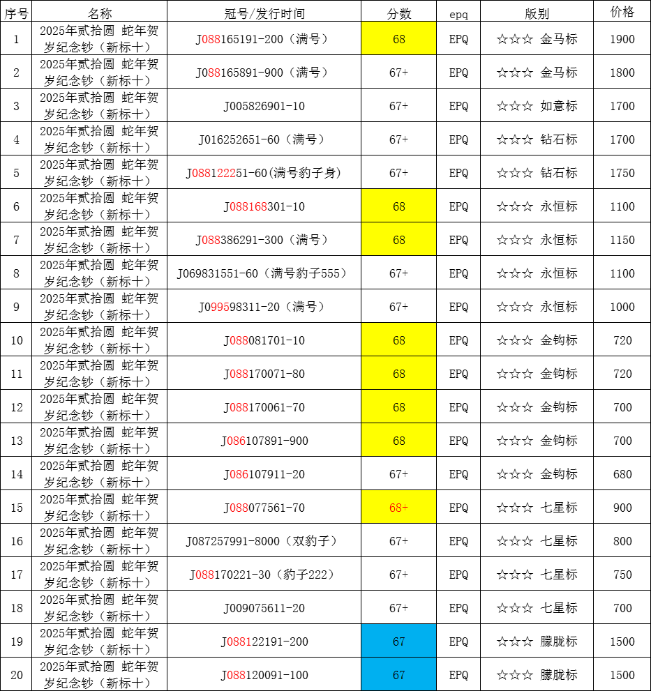 → 出蛇钞标十,爱藏新标十评级、朦胧、金马、钻石、金钩、无347等