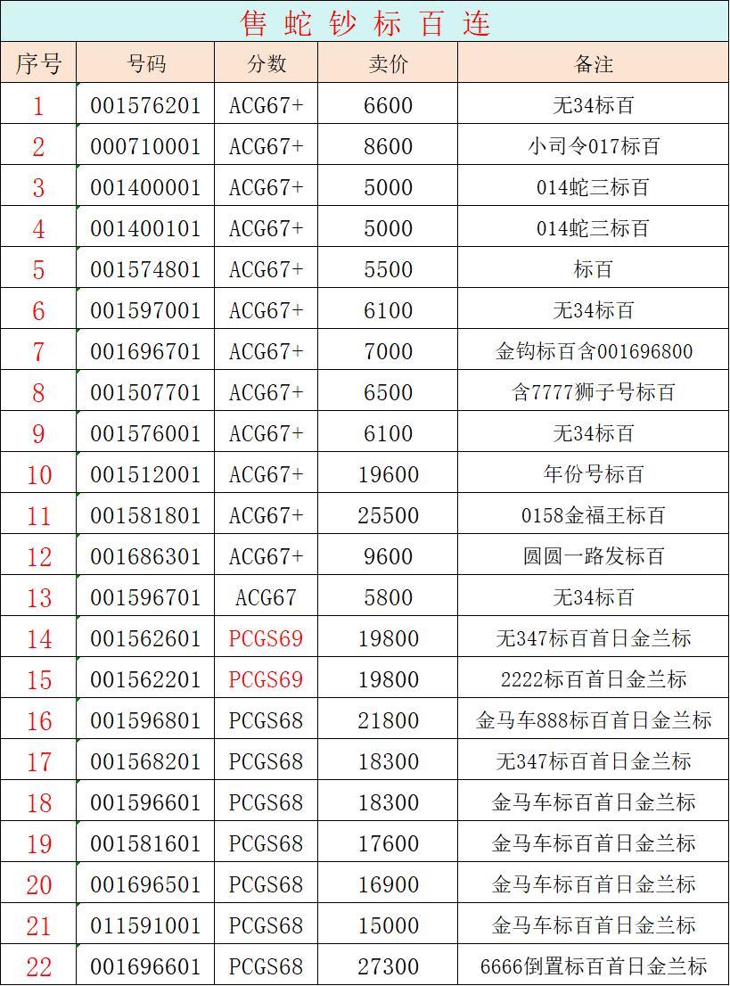 售蛇钞标百连ACG,PCGS评级钞,三包到手!