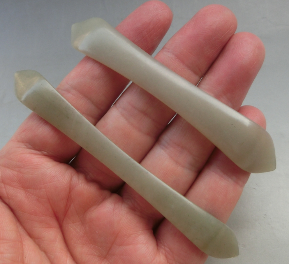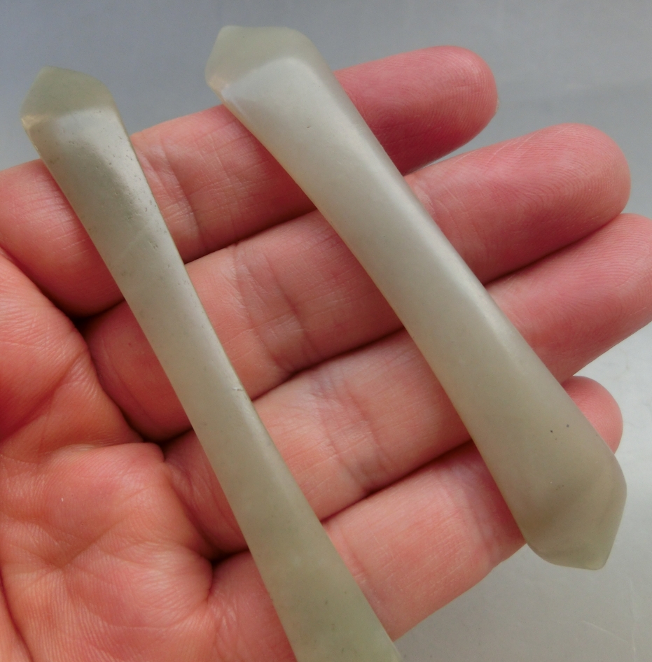 百年历史传承、玉质油润、清朝老和田玉发簪一对,长10.2厘米、宽1.1厘米、共重13.8克,品质保证,一对实价1290元。