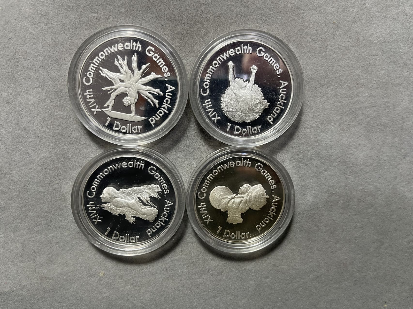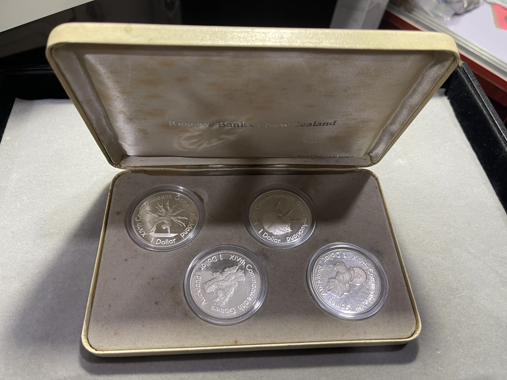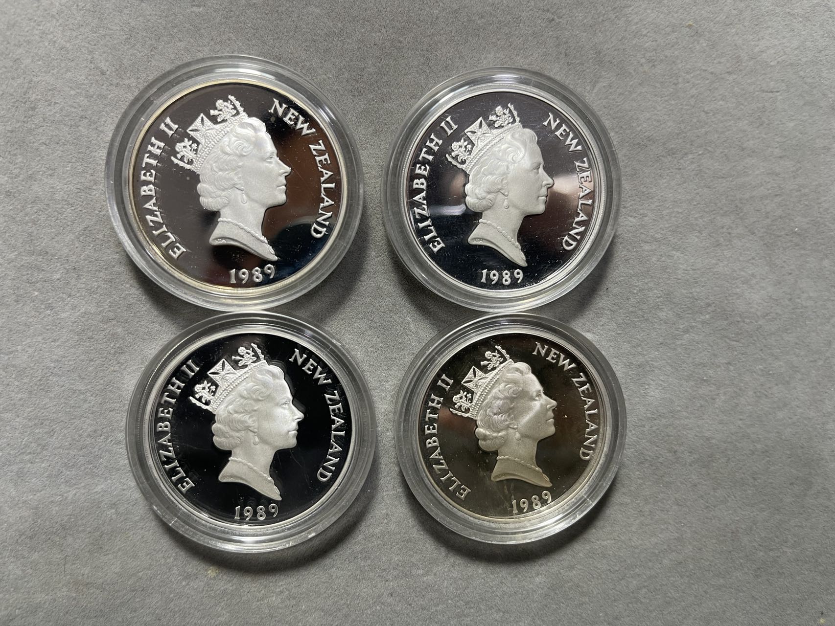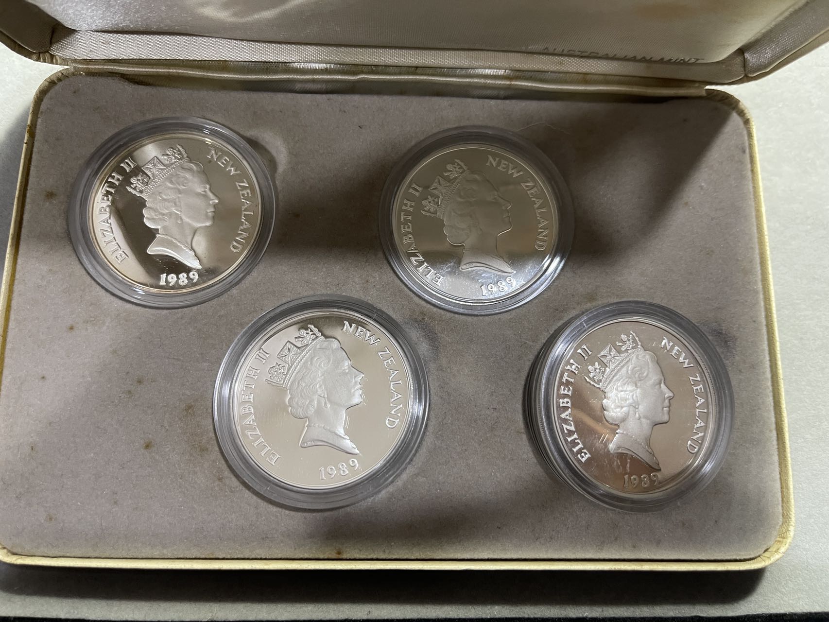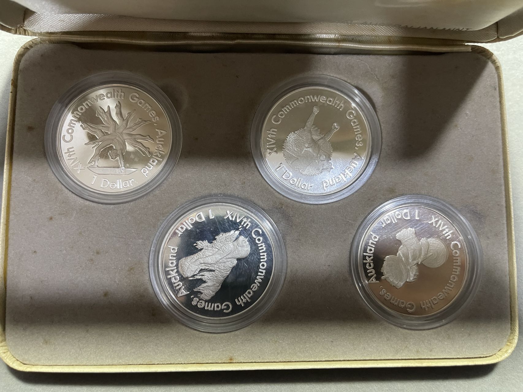 外国银币,4枚一套,精致币,纪念银币,带盒子,925银的,一枚27g,9元一克出,再乘以0.925
