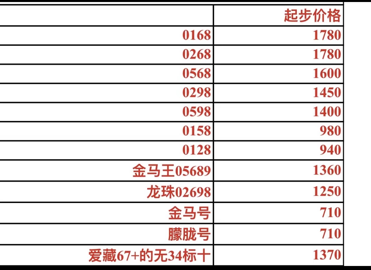 价格如图,好号码可以加价,看情况先款,以上各需要10枚,电话联系确认有效。