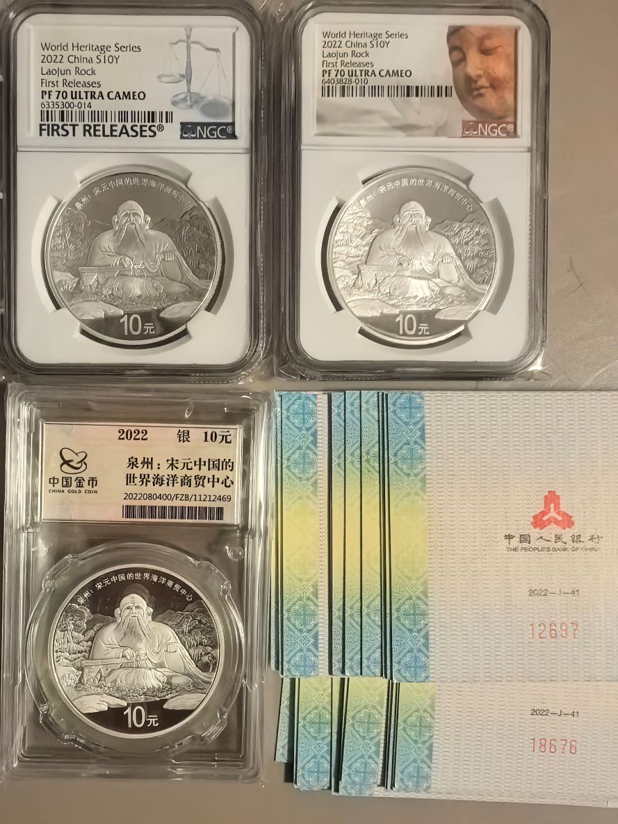 出世界遗产泉州30克银币NGC70分首期蓝标.佛头标.金总封装,空盒