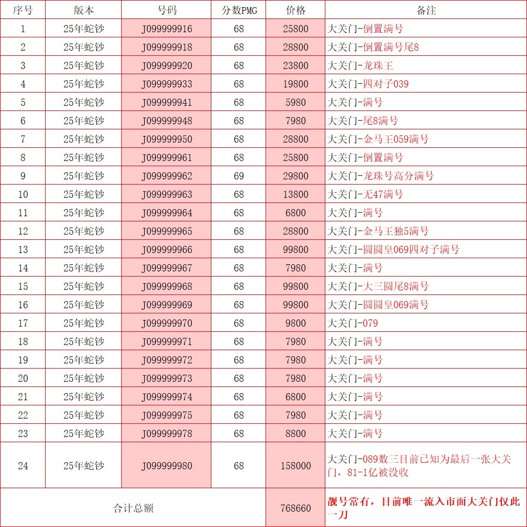 蛇钞J0999999XX大关门系列