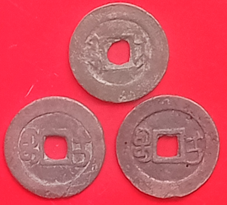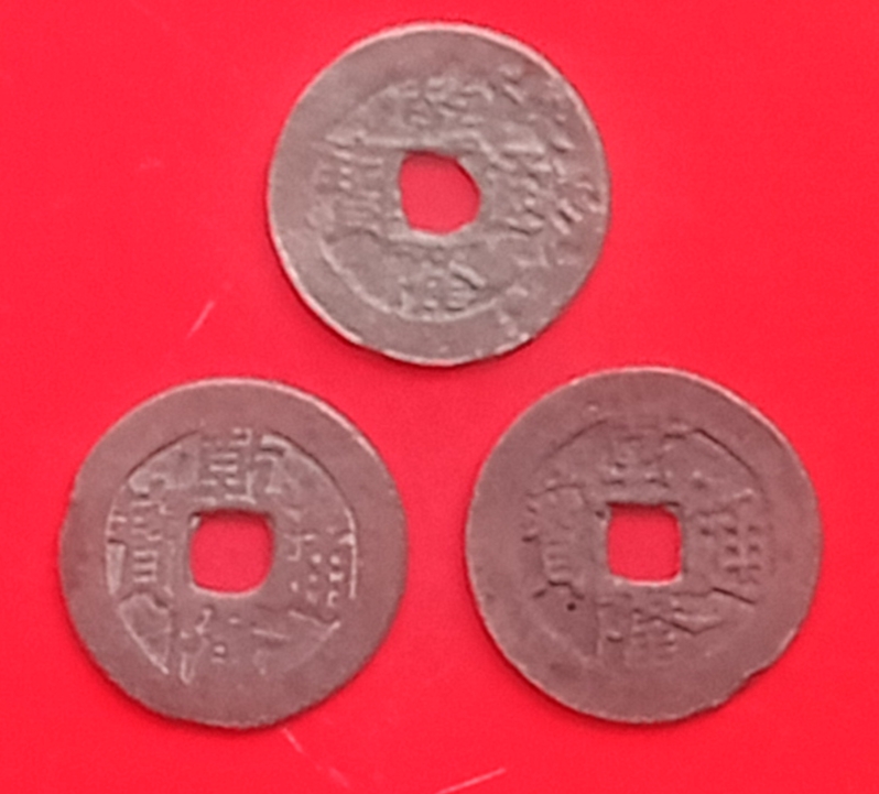 → 红钱乾隆通宝宝伊局小平钱三枚