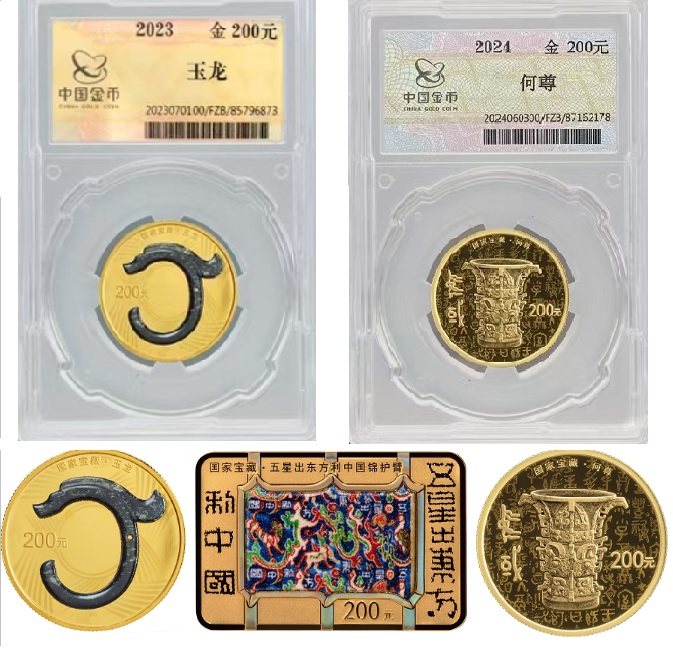 尤其是15克金币一组“龙头”玉龙(中国探月徽标原型、华夏银行LOGO出处原型、康银阁变相包装二轮龙年流通纪念币的名头)反观其设计和造币炫光等特别出彩,二组何尊甚至都有国家领导人变相代言,三组“五星出东方利中国”方形锦护臂靠言辞夺人心弦......