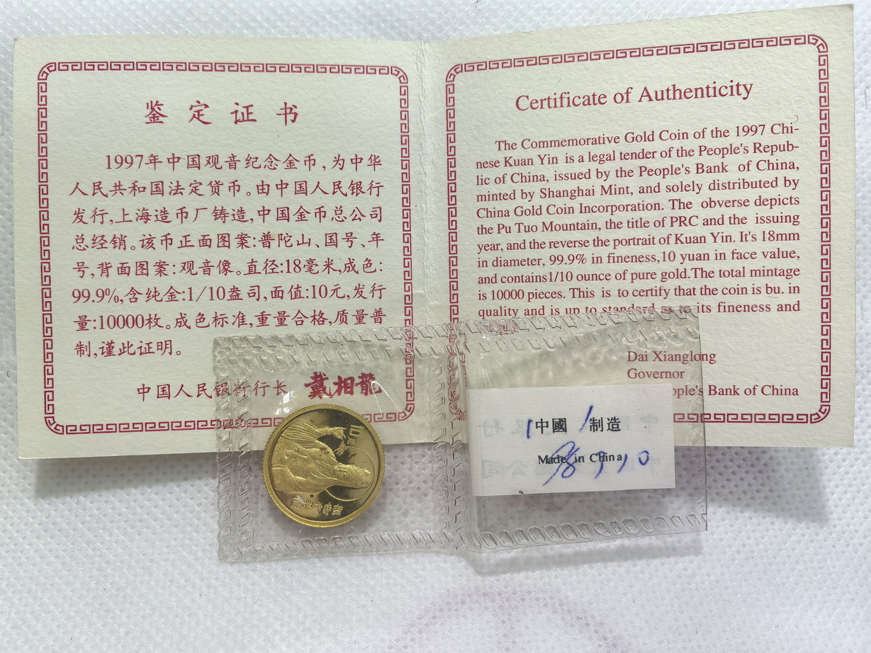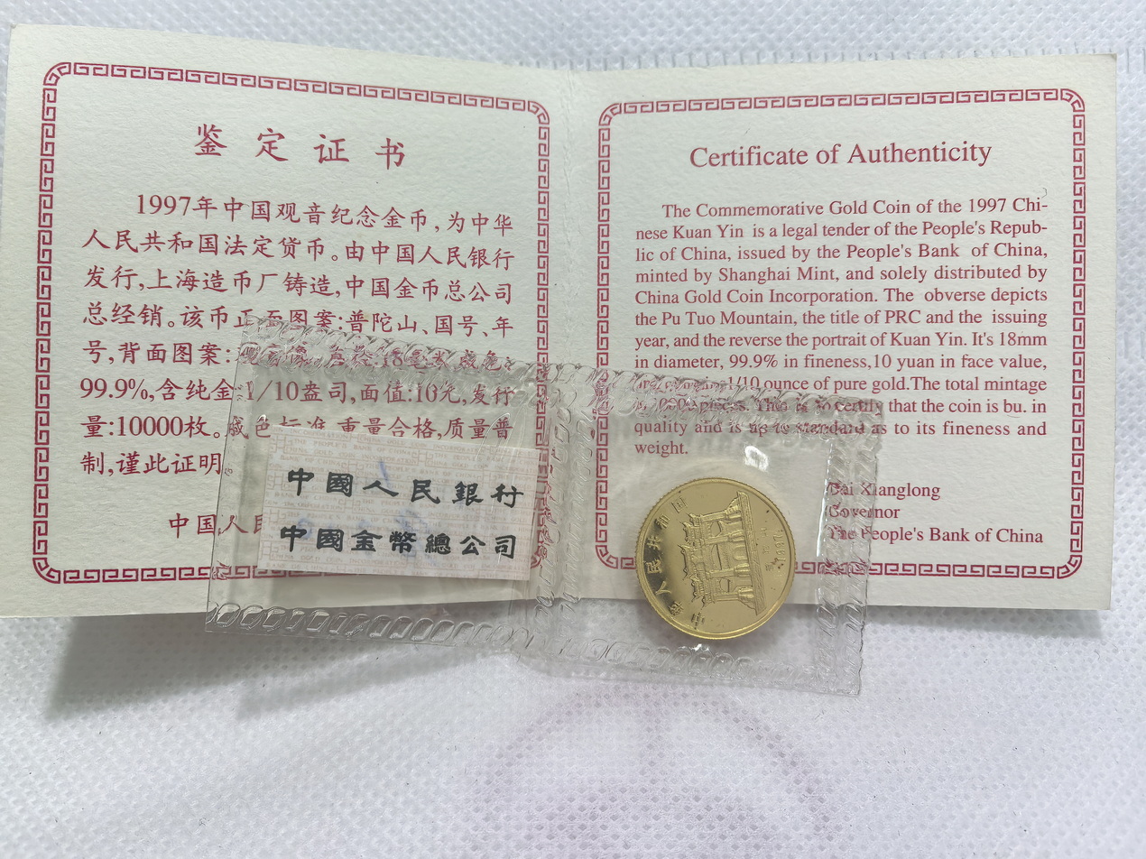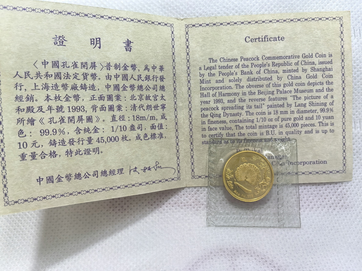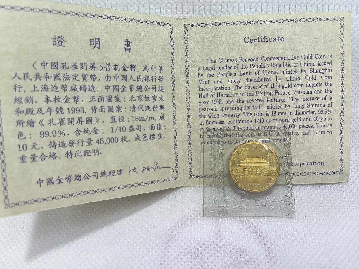 出97观音(带小封签)、93孔雀开屏金币,品相如图,原封带证书,观音:2860元/枚,孔雀:2550元/枚,包邮,电联确认