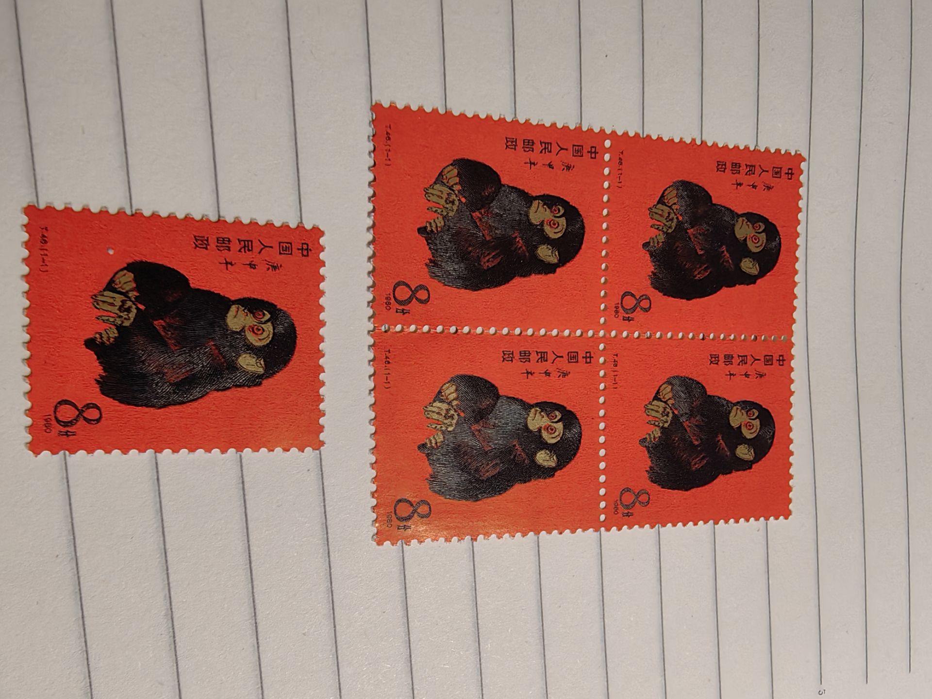 出售一轮猴 单枚的 3800元 方连 4000X4枚 方联齿孔有竖折 金粉好 不脏 无黄 可以过灯 包顺丰快递!