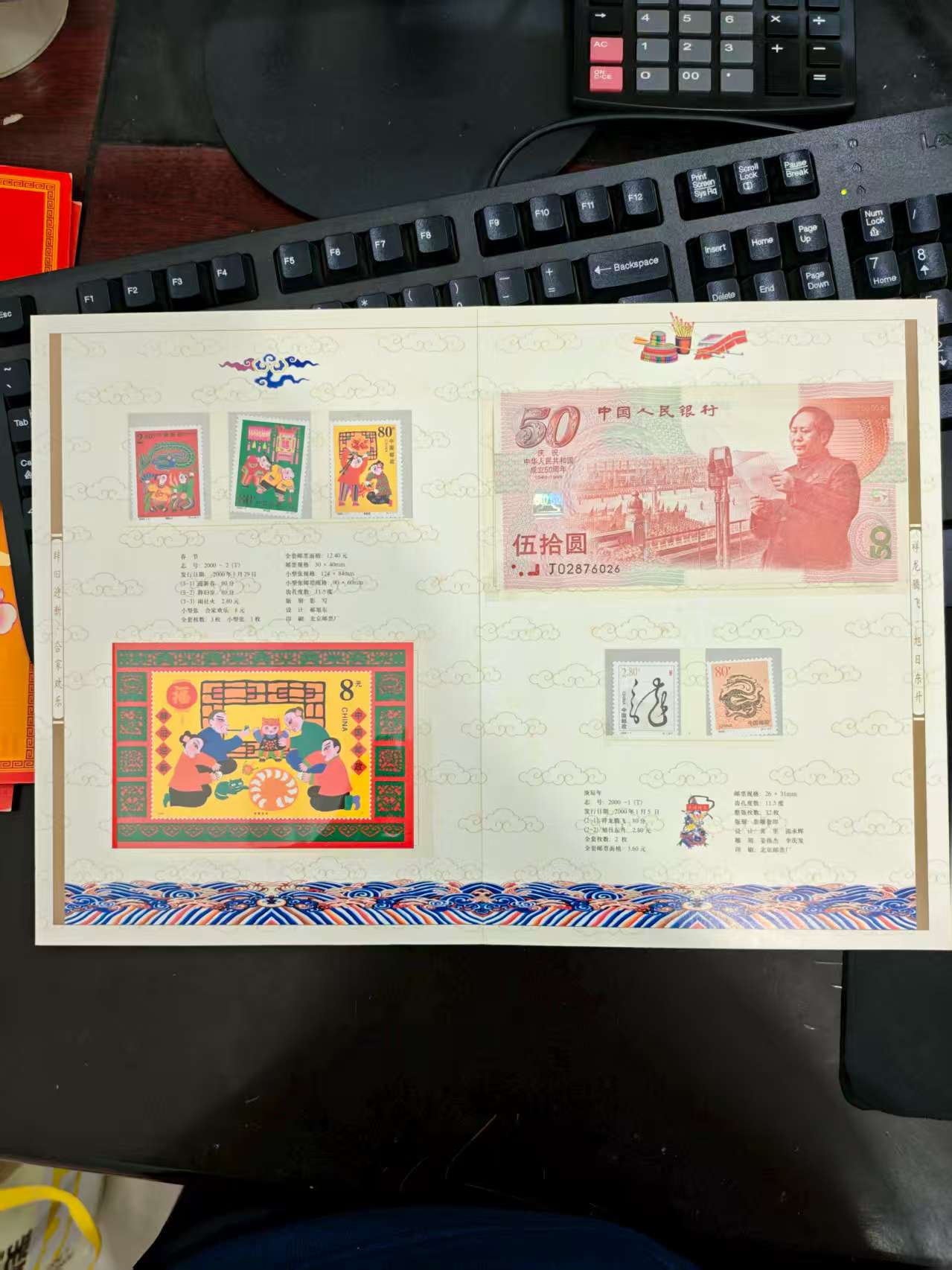 含建国50周年纪念钞的拜年折2个,纪念钞尾数号码25/56。一起走200元/个包邮。