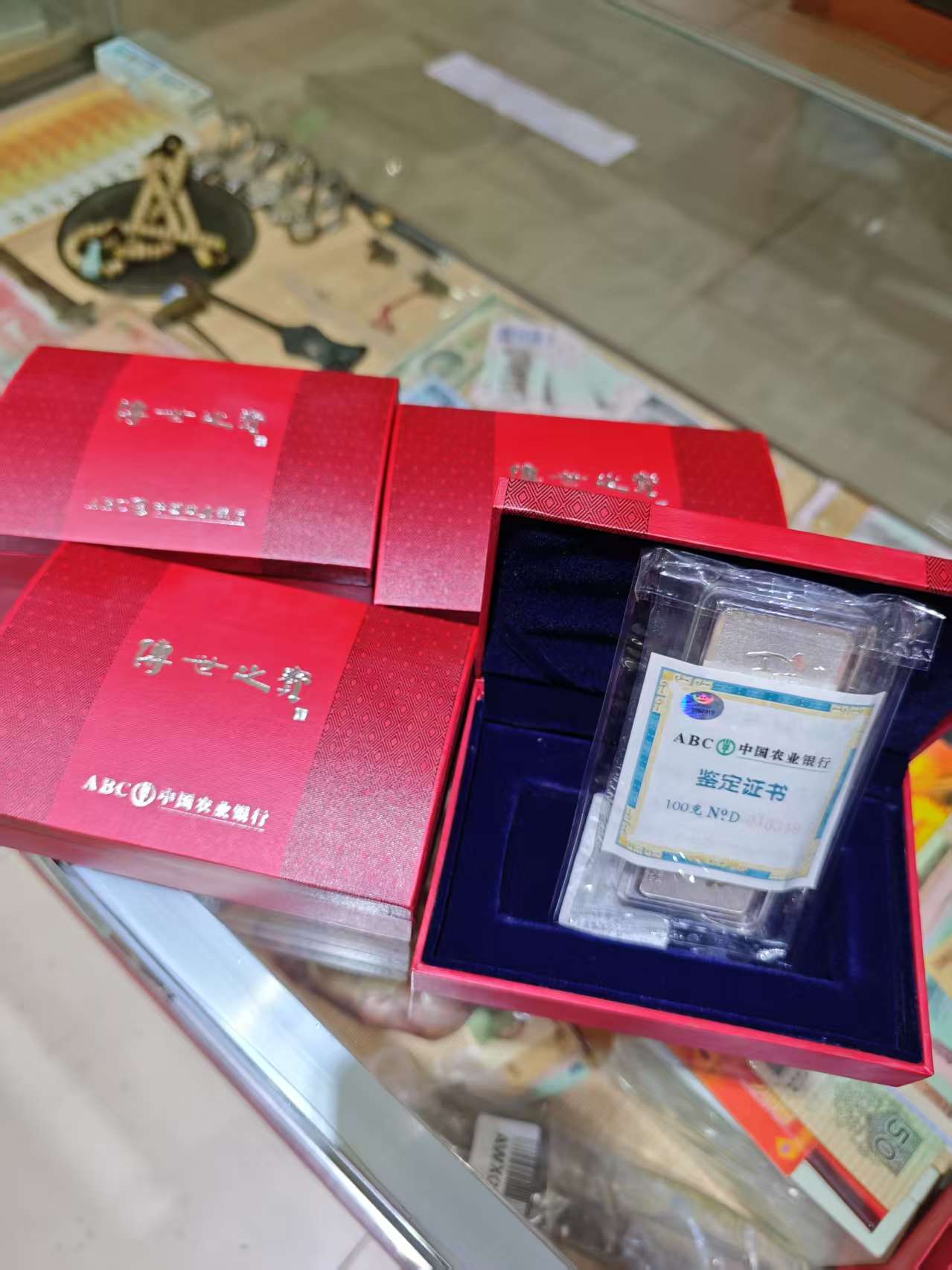 → 出农行传世之宝100克银条3件,原封原盒