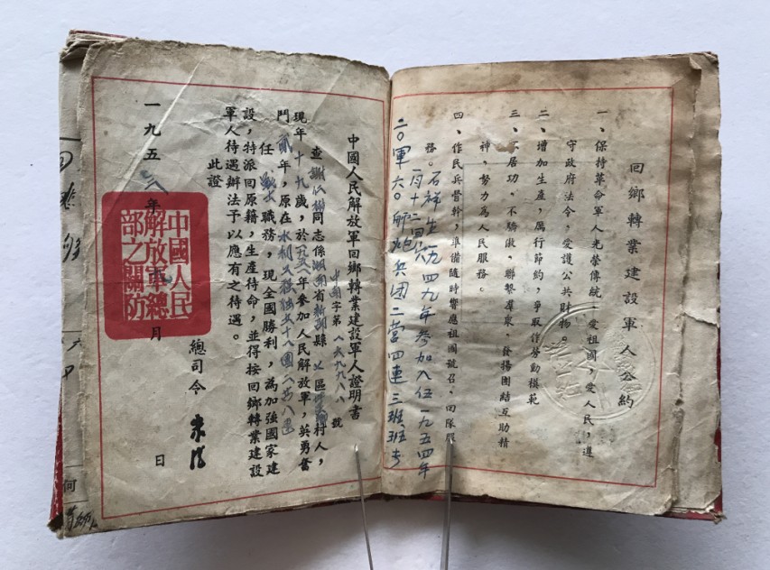 1953年志愿军(刘仁彬)转业证1本 ,长13.3,宽9.3,内有主席像,主席题词,朱德像,朱德题词,国防部长彭德怀及国防部印章,保存完好Q10,如图,原在水利工程独立十一团二营八连任战士,中南字第169988号,一九四八年九月十五日在锦州解放入伍,一九四八年九月在山东军区警备师四团三营九连任战士,一九五一年二月在中国人民志愿军二十七军八一师二十三团二营四连任战士,一九五一年五月在东北大连七医院休养,一九五一年八月在苏州苏南区医院休养,价格100元包邮,