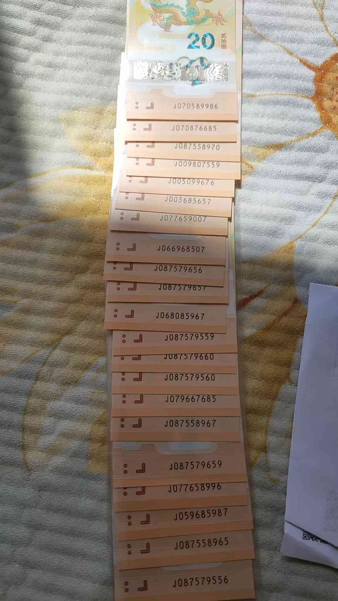 龙钞无34单张满号056789组合,0后无0,数五组合178一张,其他满号160一张,尾8的176一张,不挑号的136一张,要100张