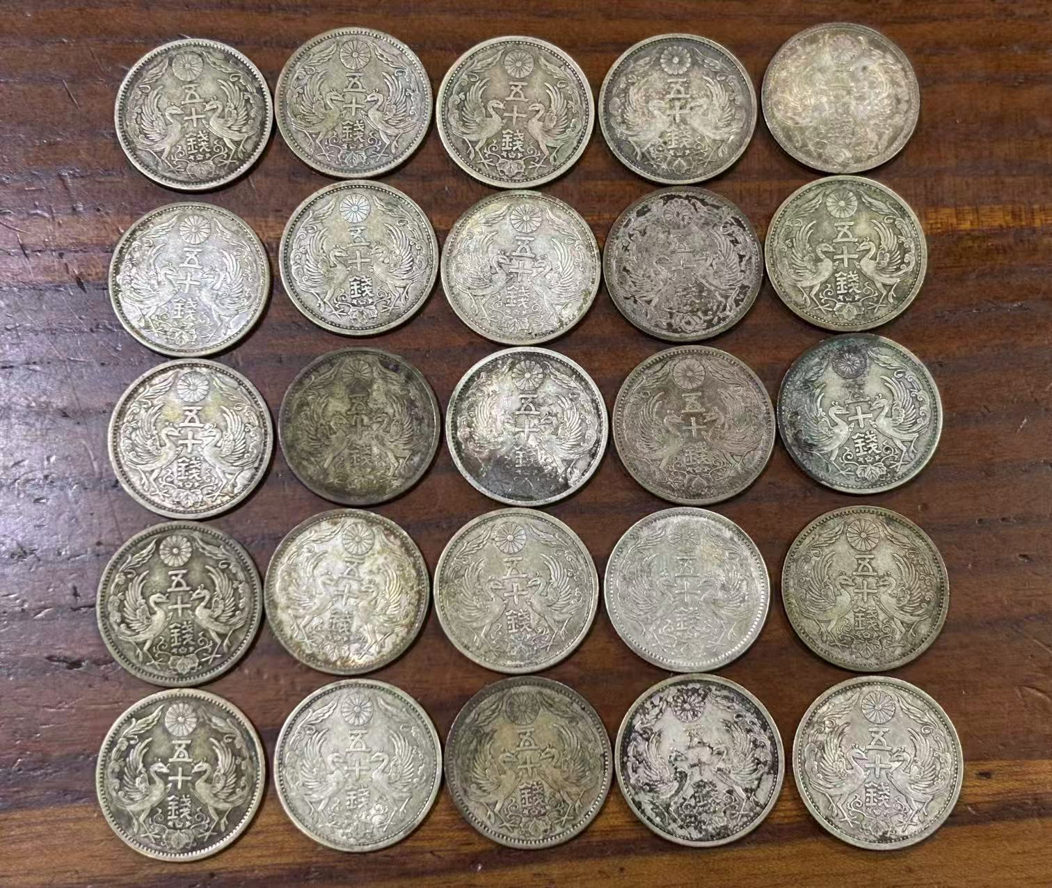 2、日本大正、昭和时期的日本双凤五十钱2700枚银币(每枚4.95克左右,含银量72%,含纯银3.56克,含铜量28%{1.39克}),按低于国际银价10.5元一克计算:2700枚*3.56克*10.5元=100926元。赠送铜2700枚*1.39克=3753克